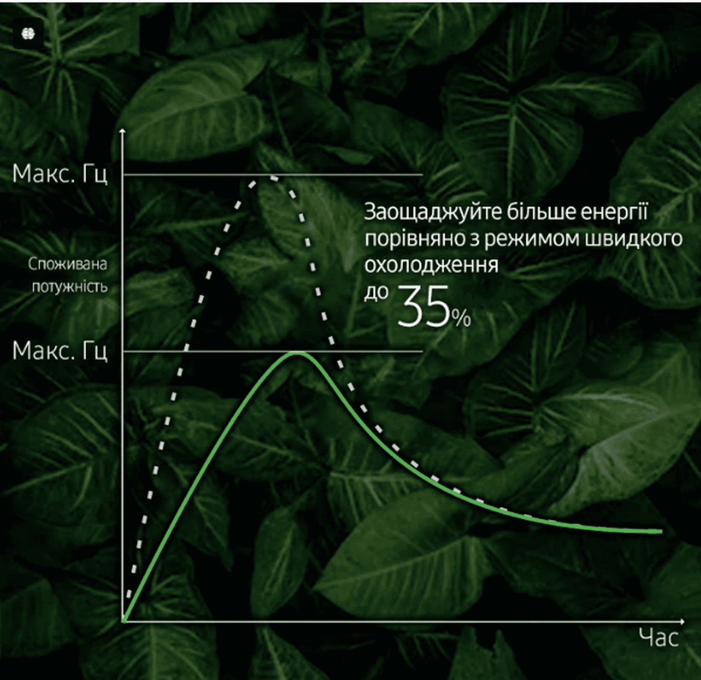 Wind-Free Cooling потребляет на 77% меньше энергии по сравнению с режимом быстрого охлаждения. Это достигается благодаря меньшей интенсивности работы компрессора и вентилятора, что уменьшает общие затраты электроэнергии.