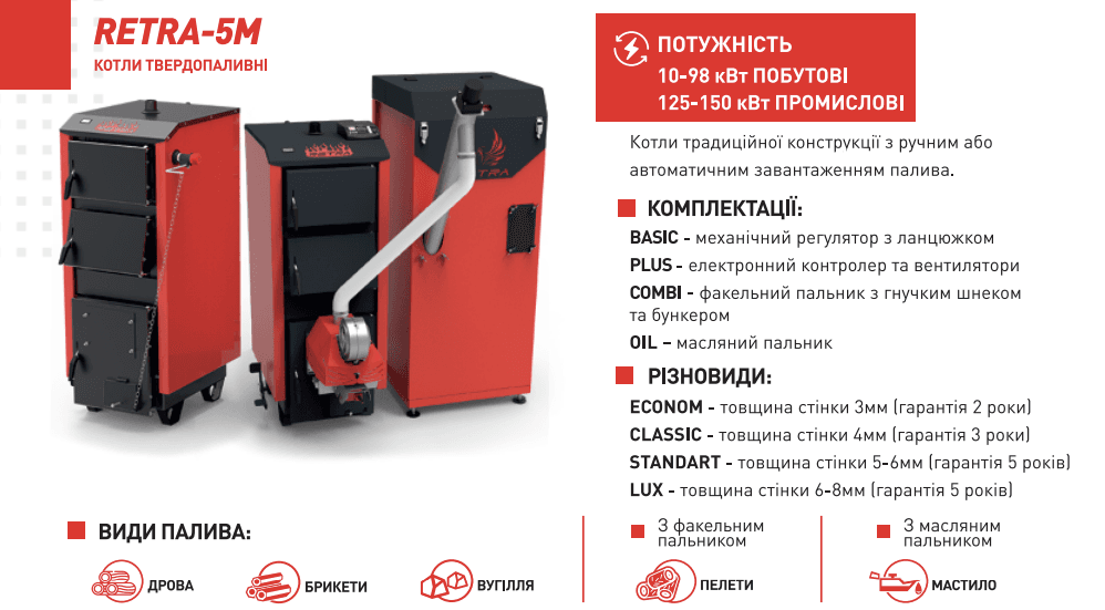 - Надежность работы котла зависит от качества топлива. Котел Retra-5М в ручном режиме адаптированы для сжигания угля и брикетов различного ассортимента.