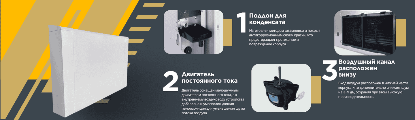 - Вход воздуха расположен в нижней части корпуса, что дополнительно снижает уровень шума на 3–9 дБ, при этом сохраняя высокую производительность.