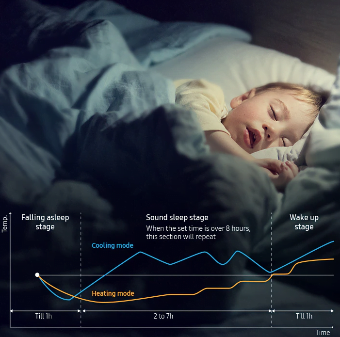 Режим «Хороший сон» позволяет регулировать температуру с использованием функции охлаждения Wind-Free. Это помогает быстро засыпать, обеспечивая приятный и стабильный сон.