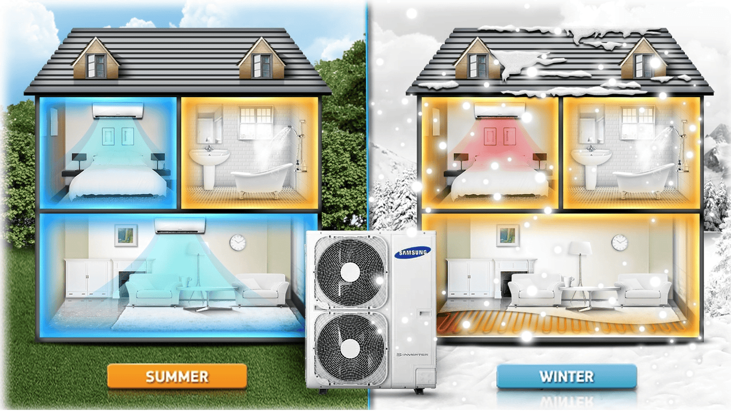 Универсальность использования: Модель AE056MNJDEH/EU сочетает в себе функции охлаждения и обогрева, что делает ее идеальной для поддержания комфортной температуры в помещении в любое время года. Уникальная возможность работать как с водой, так и с воздухом одновременно делает этот блок идеальным для домов с ограниченным пространством.