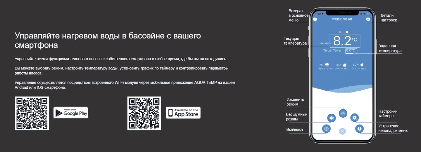 Благодаря встроенному модулю Wi-Fi, пользователь может управлять насосом прямо со смартфона. Специальное приложение позволяет запускать или останавливать устройство, изменять температуру и контролировать параметры работы удаленно — где бы вы ни находились.