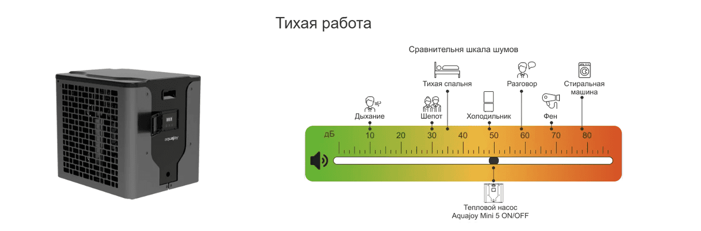 Aquajoy Mini 5 ON/OFF способен функционировать при температуре воздуха до -5°C, поддерживая температуру воды в пределах +15…+40°C. Это позволяет начинать купальный сезон раньше и заканчивать его позже. Дополнительные антивибрационные накладки снижают уровень шума и вибраций, продлевая срок службы устройства и повышая комфорт использования.