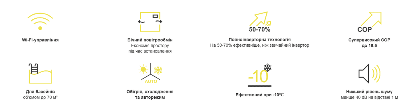 Благодаря боковому выбросу воздуха агрегат работает гораздо тише, чем стандартные модели с вертикальным или задним выбросом. Это снижает уровень шума на 4–6 дБ и минимизирует дискомфорт, что особенно важно при установке рядом с бассейном или жилым домом.
