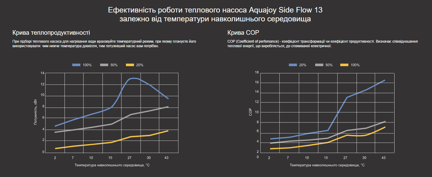 Максимальная тепловая мощность устройства составляет 13 кВт, а коэффициент производительности (COP) достигает до 16,5 — это один из самых высоких показателей в своём классе. Насос работает в диапазоне температур воздуха от -10 до +43°C, обеспечивая подогрев воды от +9 до +40°C, а также охлаждение в пределах +8 до +28°C. Это делает Aquajoy Side Flow 13 подходящим для использования круглый год.