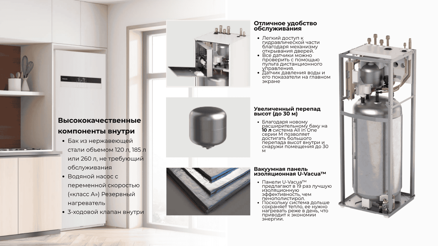 Кроме того, встроенный датчик давления воды позволяет системе точно контролировать рабочие параметры, обеспечивая стабильную и безопасную работу в любых условиях. Благодаря изоляции U-Vacua™ — высокоэффективному вакуумному теплоизоляционному материалу — сводятся к минимуму теплопотери, что дополнительно повышает энергоэффективность всей системы.