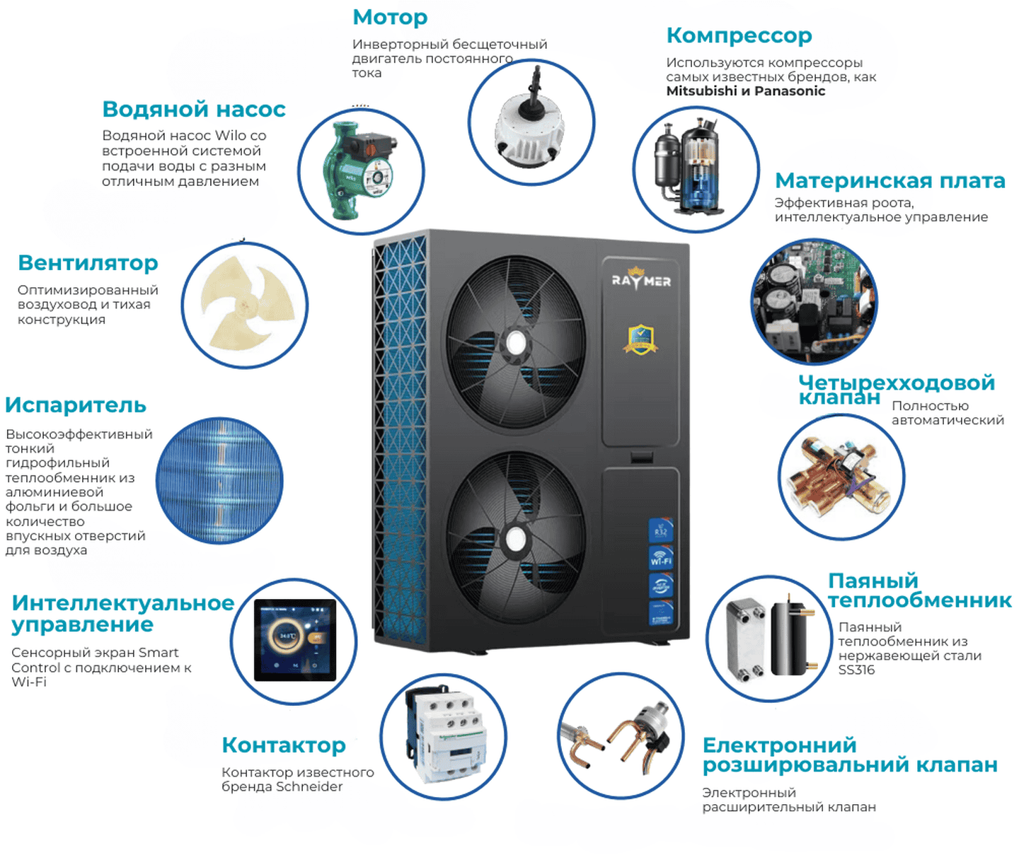 Тепловой насос Raymer RAY-15D2MN-EVI 380В  имеет продуманную комплектацию, которая обеспечивает высокую эффективность, надежность и удобство эксплуатации: