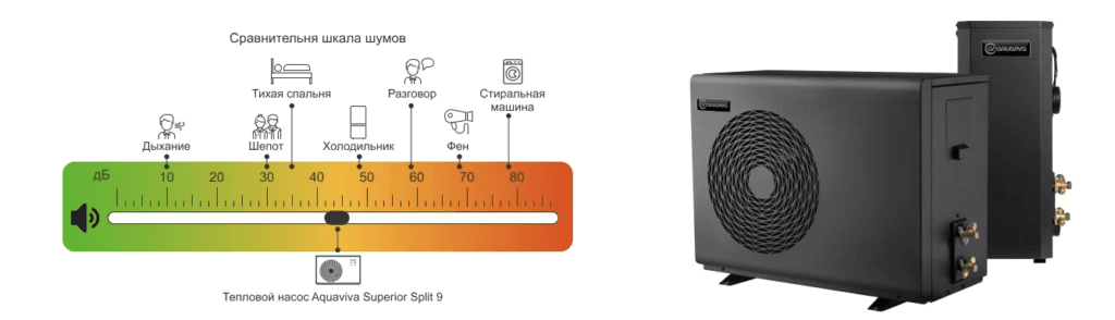 - Уменьшенный уровень шума: Благодаря использованию тихого инверторного компрессора и полноинверторной вентиляции, инверторный насос Aquaviva Superior Split значительно тише обычных моделей. При достижении заданной температуры насос переходит в режим экономии, используя 25-80% своей мощности, что позволяет значительно снизить уровень шума во время его работы и обеспечить комфортное использование.