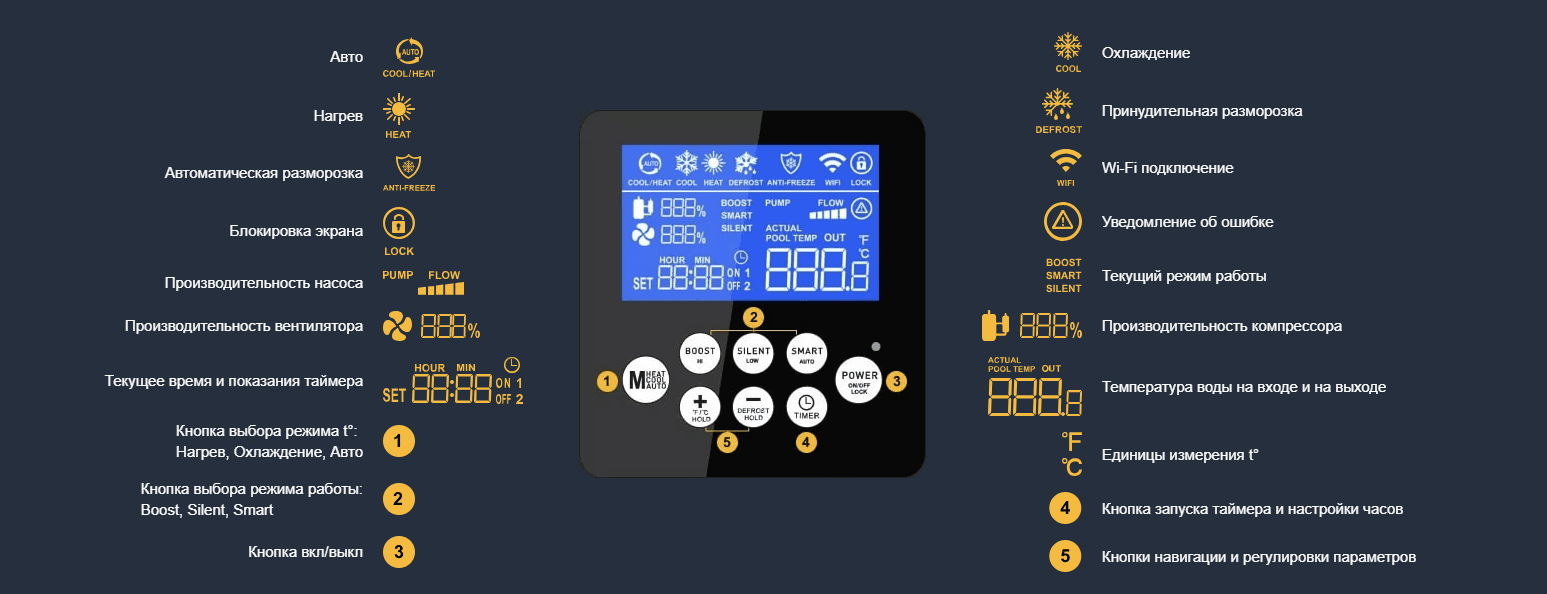 - Выбор режима работы: Контроллер позволяет легко переключаться между различными режимами работы, такими как нагрев, охлаждение или автоматическое поддержание температуры, обеспечивая максимальную гибкость в эксплуатации насоса в соответствии с потребностями пользователя.