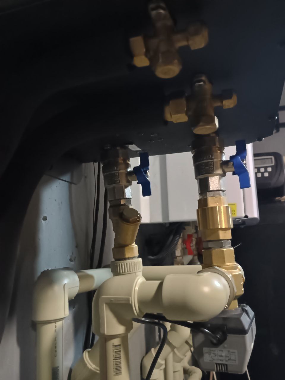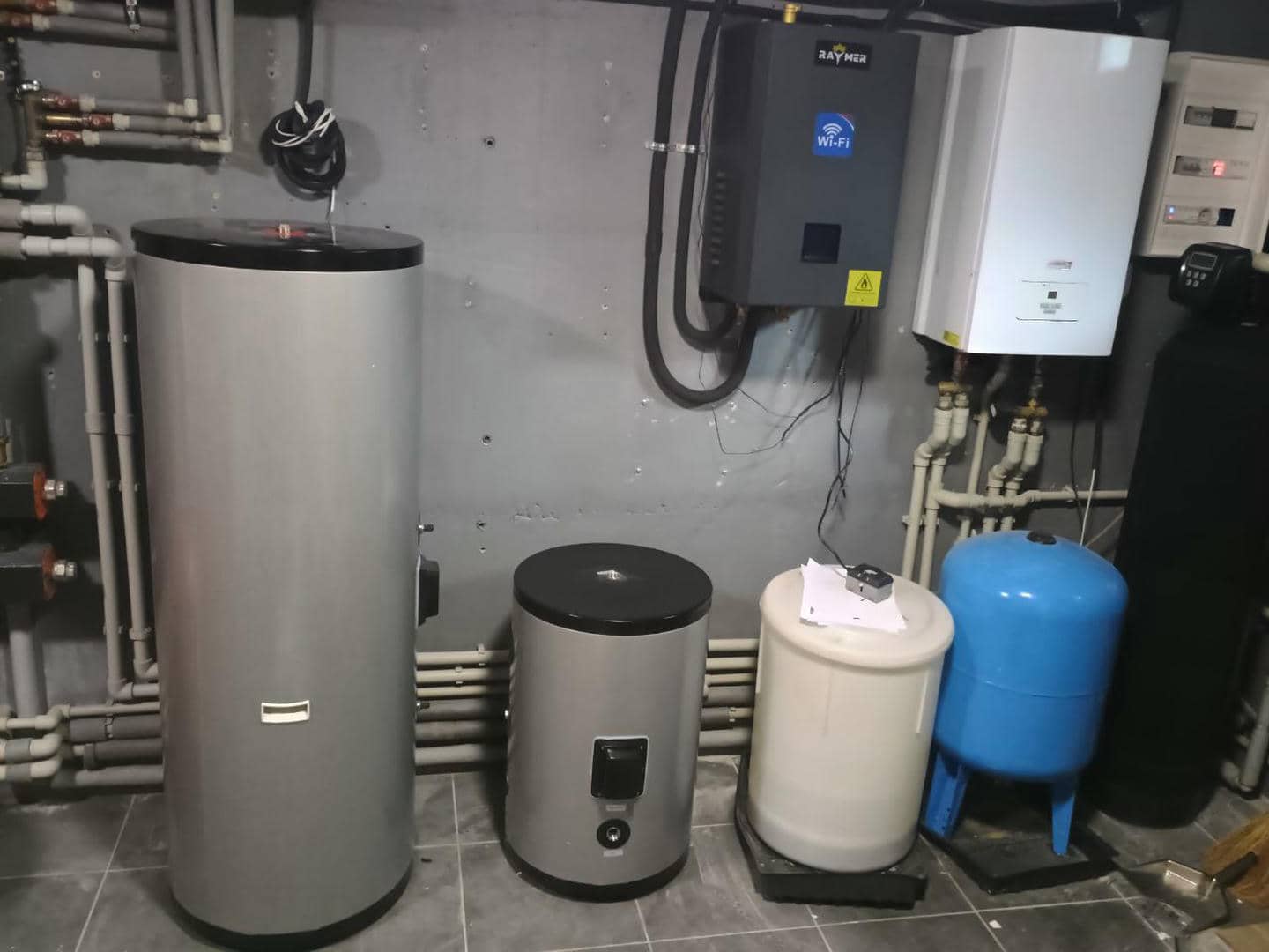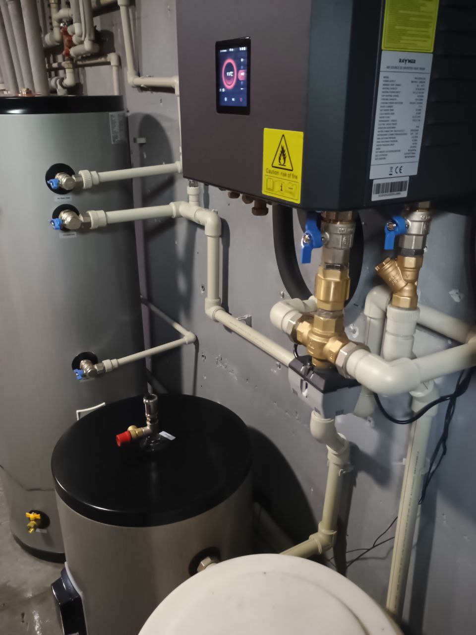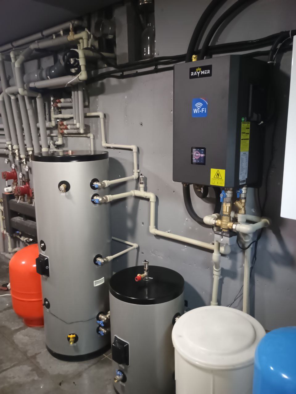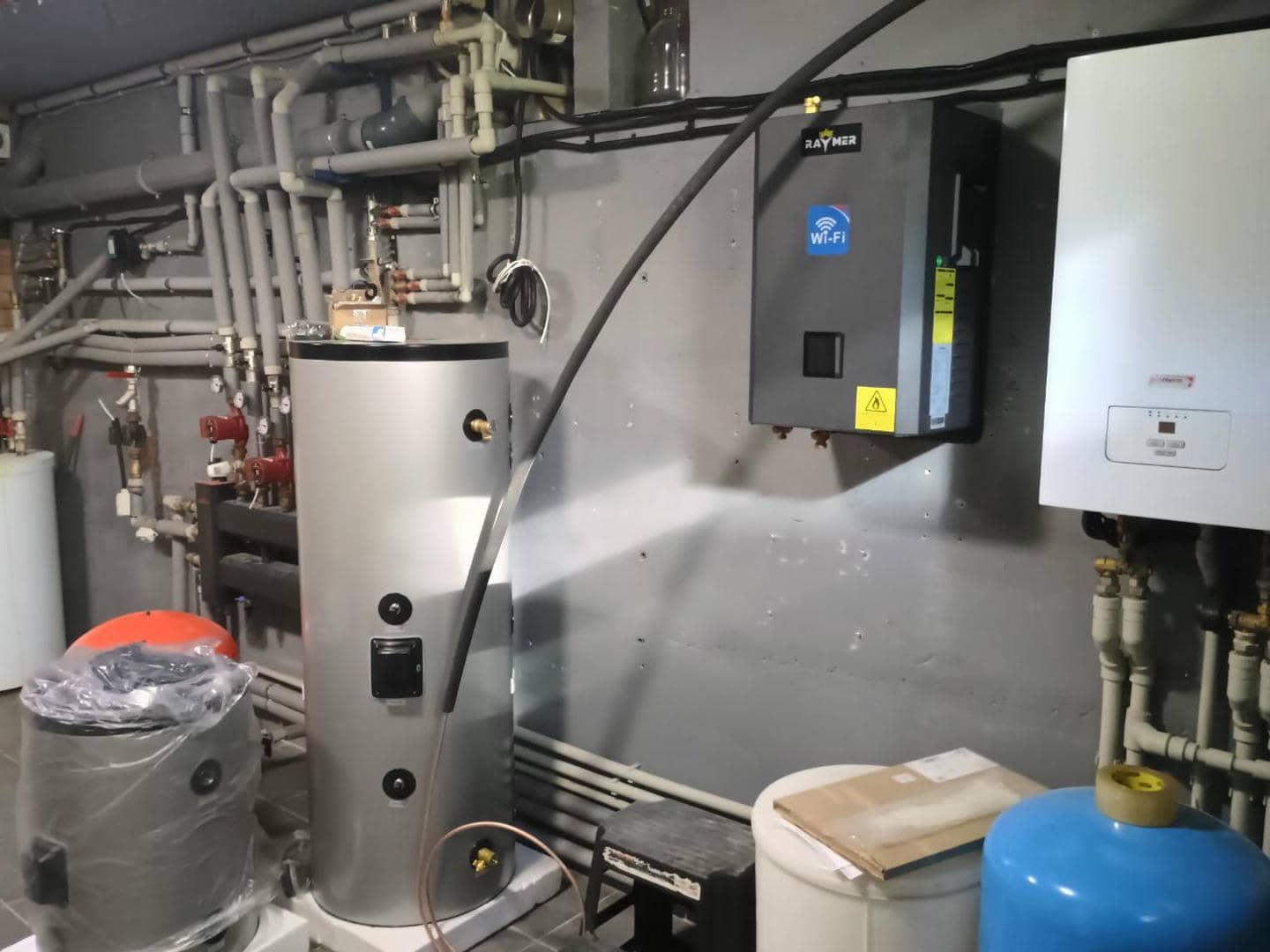 В этом проекте гидромодуль теплового насоса Raymer RAY-15DS2-EVI был установлен в техническом помещении рядом с уже имеющимся электрокотлом. Такое расположение выбрано не случайно — это позволило рационально использовать существующую обвязку системы отопления, а также упростить подключение к гидравлическому контуру.