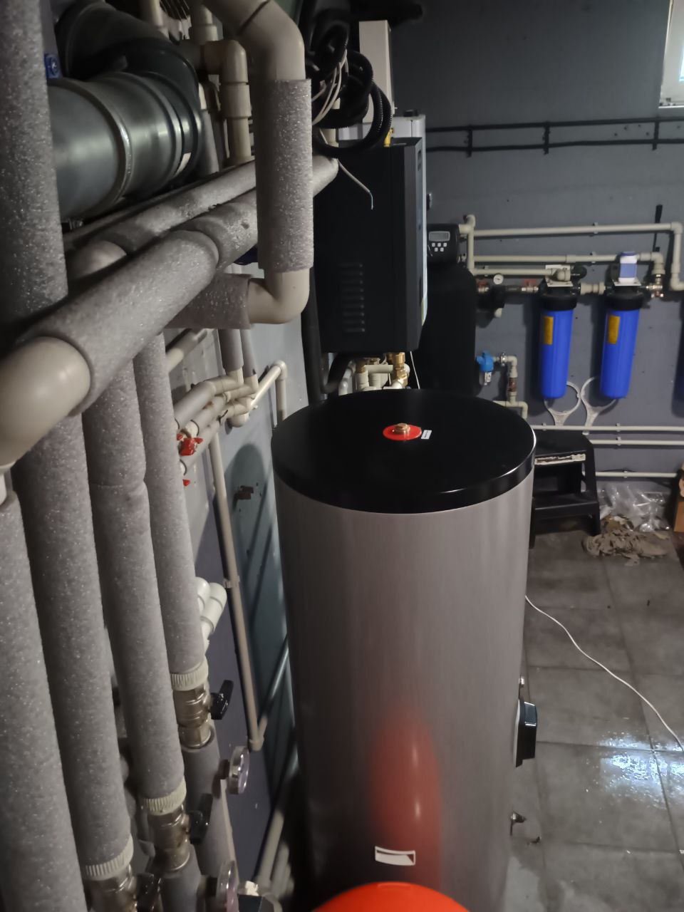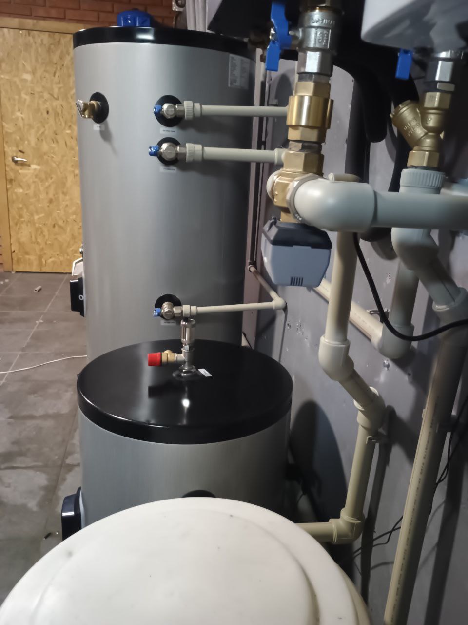 ГВС: установлен бойлер косвенного нагрева, к которому подключен контур нагрева от теплового насоса, что позволяет получать горячую воду без дополнительных электронагревателей.