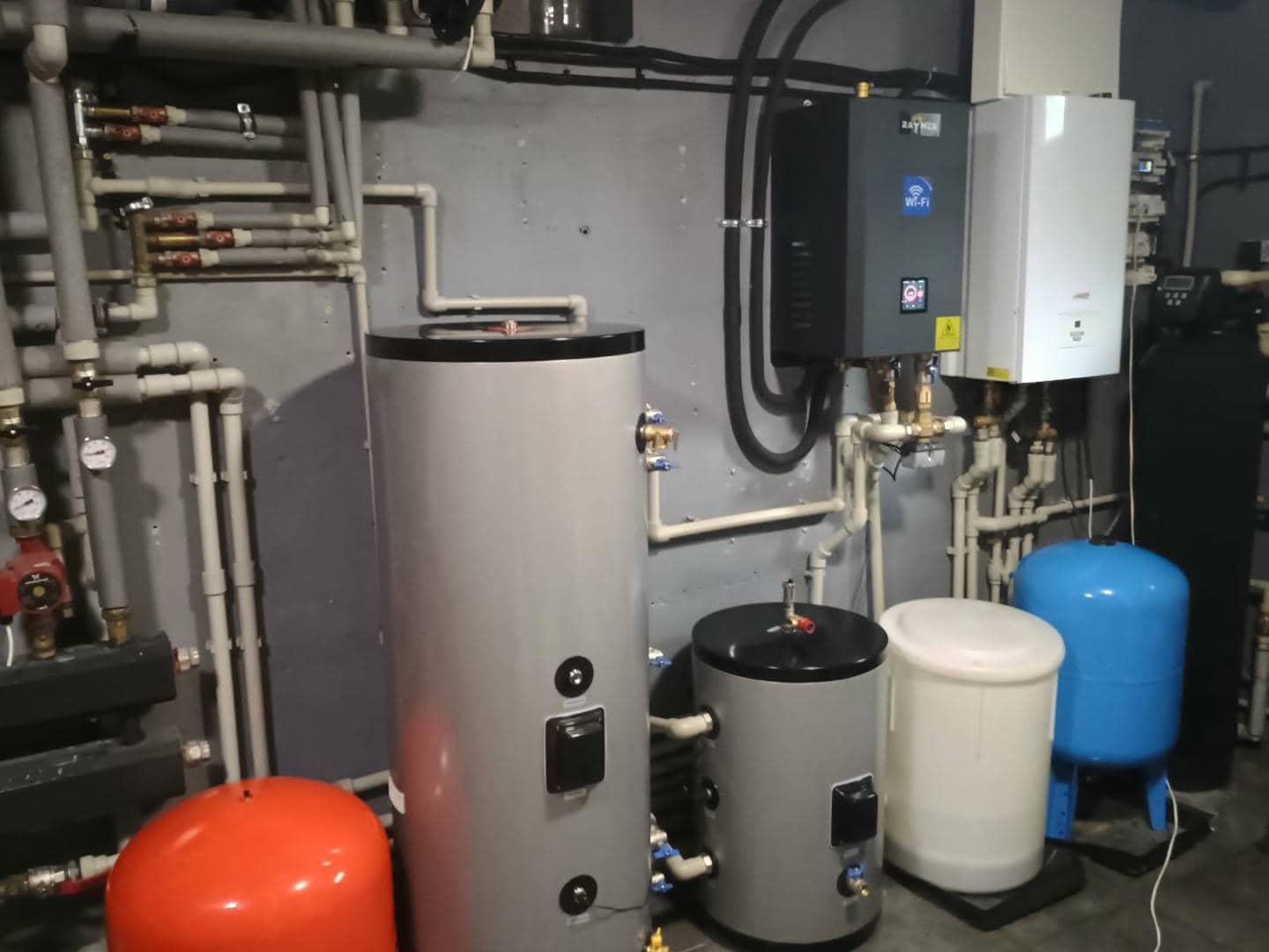 Бак ГВС Raymer DWHP 150, расположенный перед буферной емкостью, отвечает за подготовку горячей воды для бытовых нужд. Его подключение организовано через трехходовой клапан, который управляет направлением потока теплоносителя: в моменты, когда есть потребность в нагреве воды для ГВС, клапан переключает поток из буферной емкости на теплообменник бойлера. После достижения заданной температуры или завершения ГВС-цикла, клапан снова направляет теплоноситель в буферную емкость.