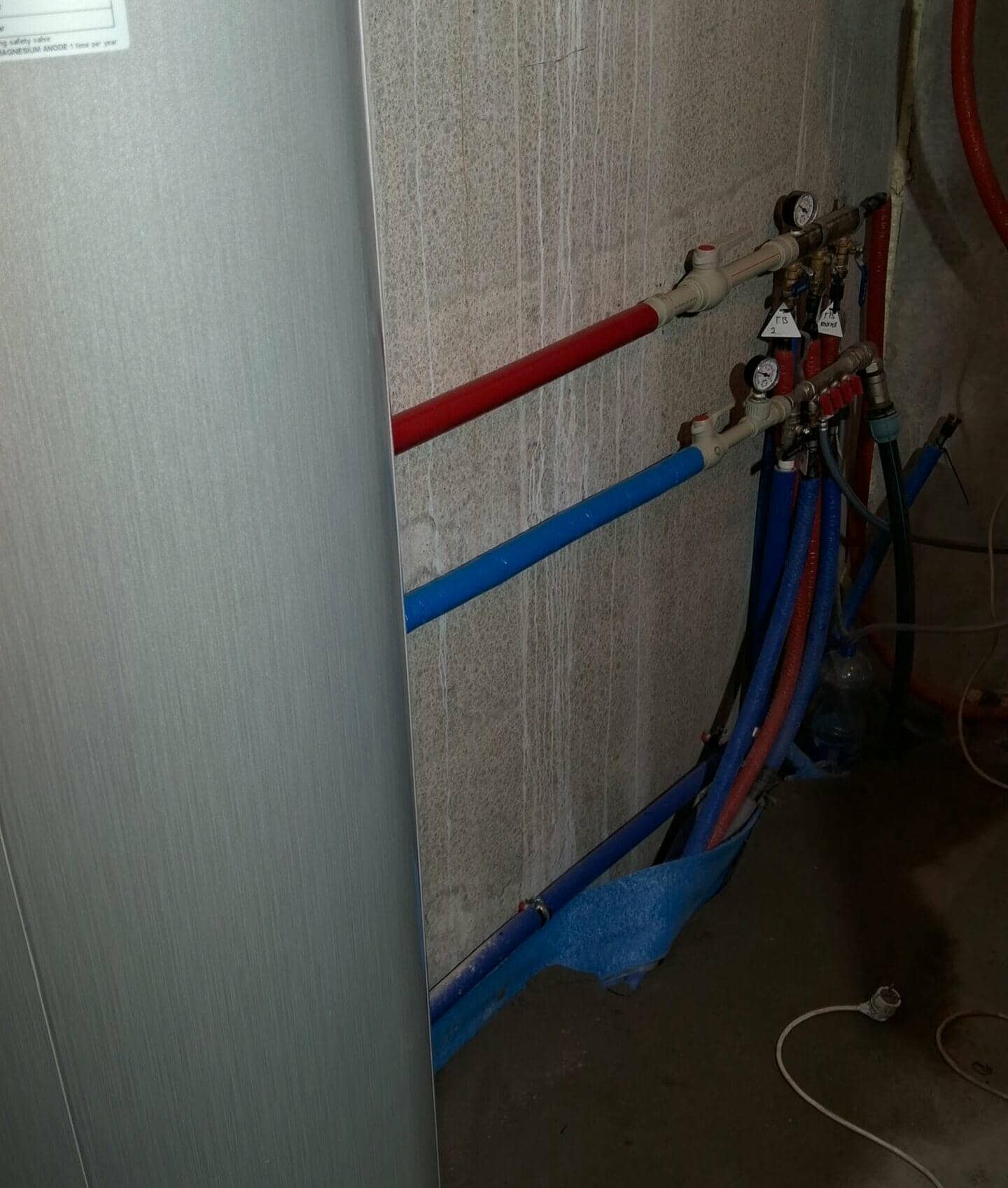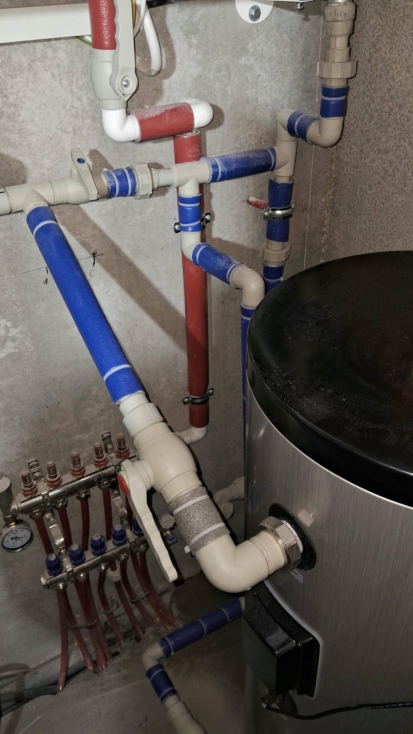 Бак был установлен на прочный пол, максимально близко к внутреннему блоку теплового насоса. Это обеспечило компактность монтажа, удобный доступ для обслуживания и минимизацию потерь тепла в системе трубопроводов.