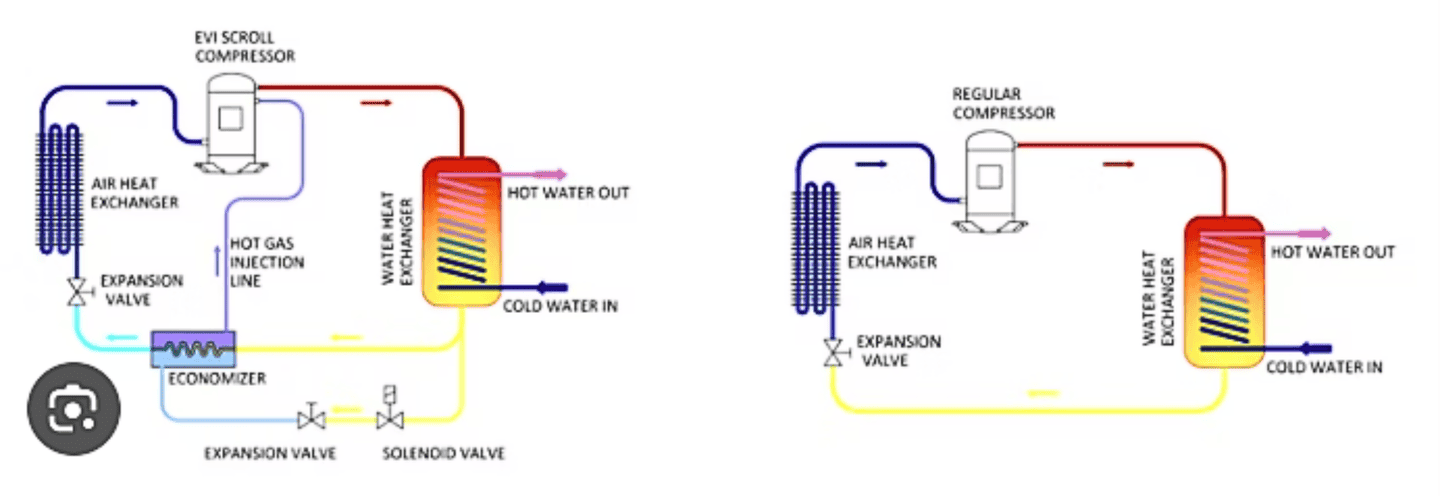 Компресор теплового насоса з EVI зазвичай має двоступеневу конструкцію, яка дозволяє приймати пару не лише з випарника, а й із економайзера. Завдяки цьому компресор може: