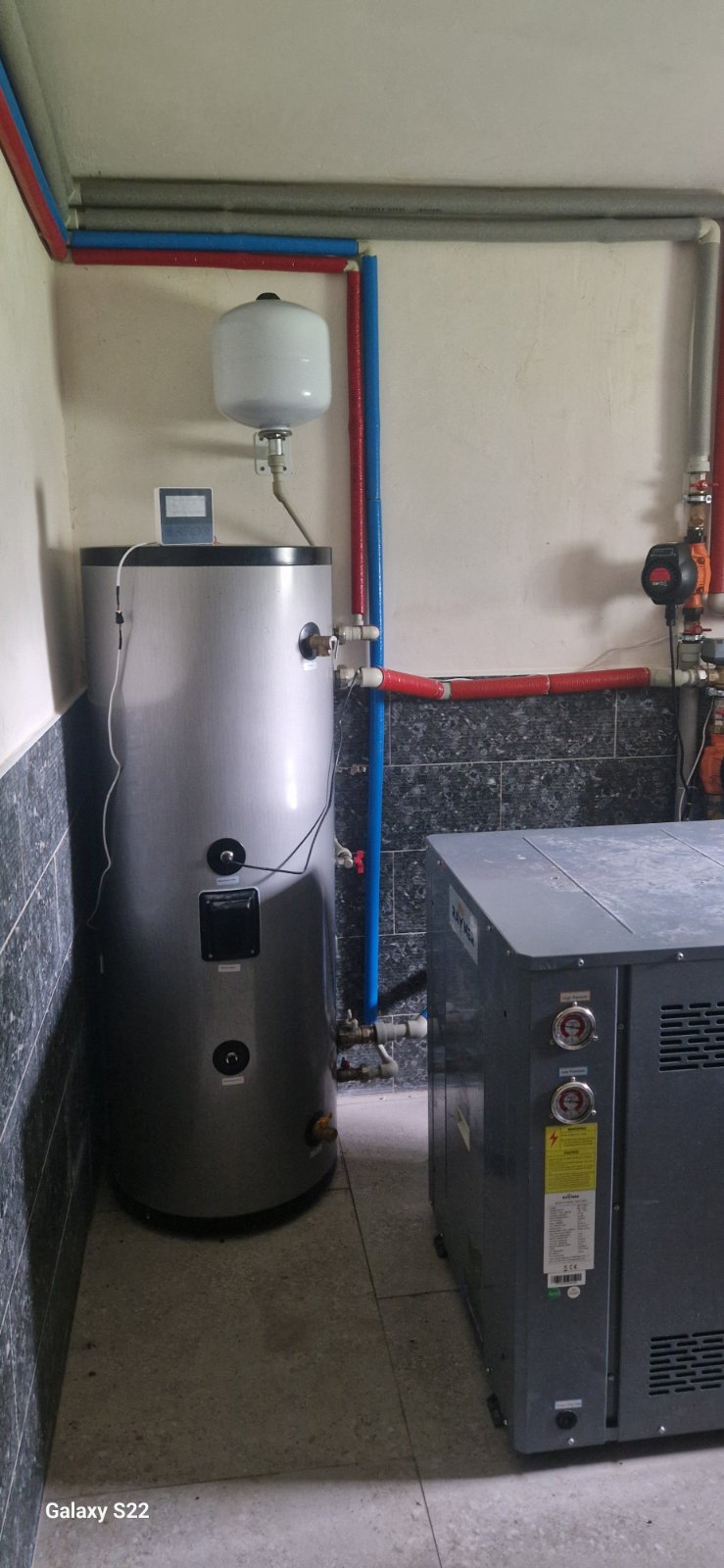 Наступним етапом було встановлення геотермального теплового насоса Raymer RAY-17WW. Це передбачало підключення насоса до існуючої системи опалення будинку, встановлення бака непрямого нагріву для ГВП та інтеграцію триходового клапана. Додатково був встановлений розширювальний бак для забезпечення стабільності тиску в системі.
