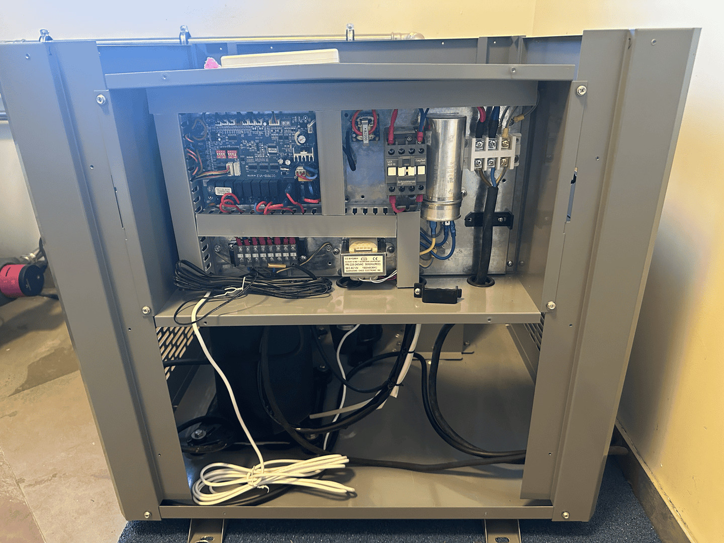 Блок теплового насоса був розміщений у котельні на оптимальній відстані від ключових компонентів системи, що забезпечує легкий доступ до з’єднань, клапанів і самого насоса, спрощуючи технічне обслуговування та підвищуючи ефективність роботи всієї системи.