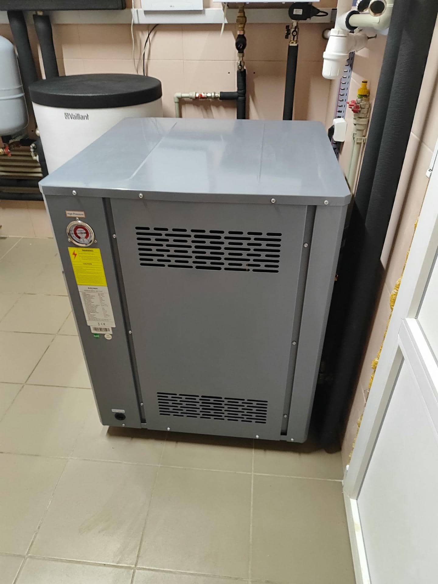Блок теплового насосу було встановлено в сухому та вентильованому приміщенні — котельні — на оптимальній відстані до всіх компонентів системи, що спрощує обслуговування та дає можливість вільного доступу до з’єднань, клапанів та насосу.