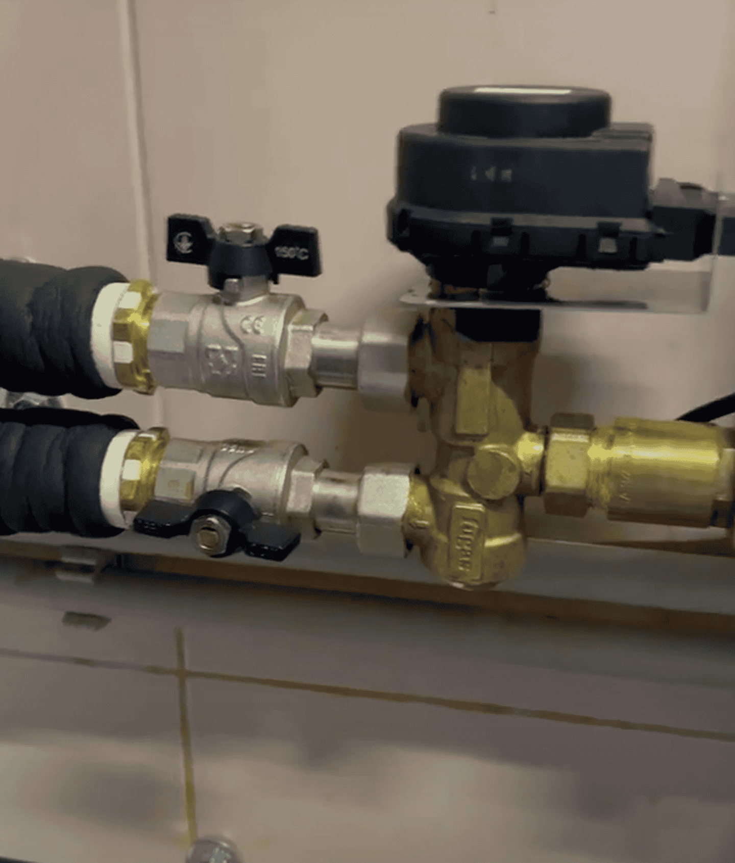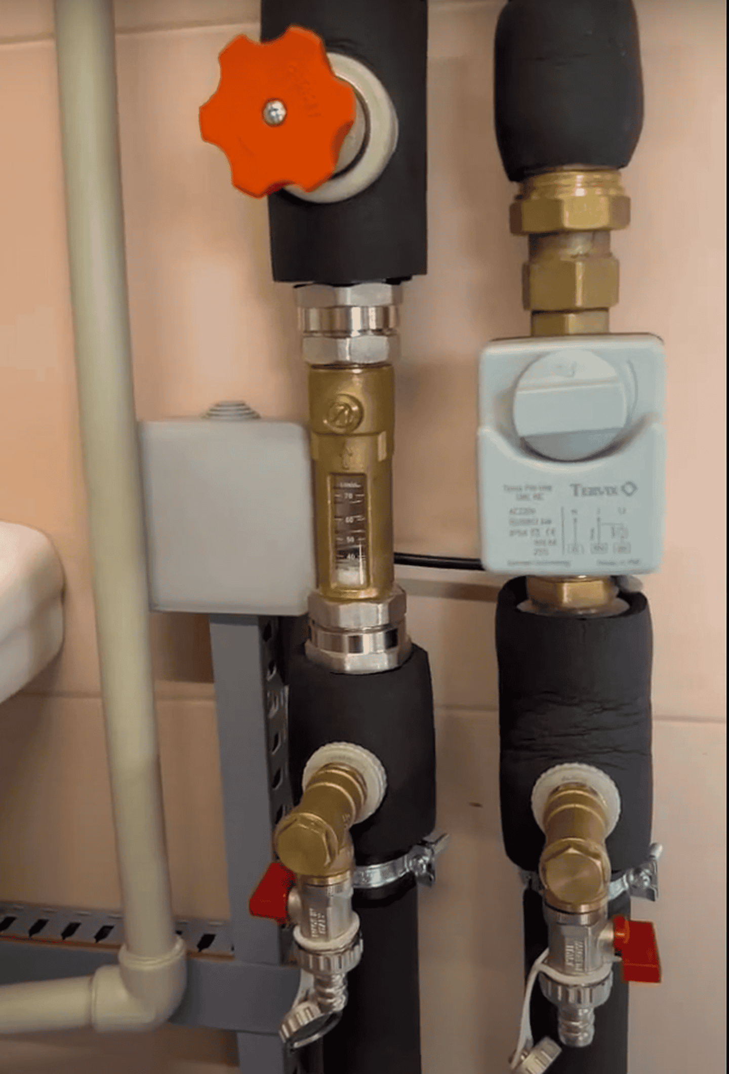 В дану систему на вході теплоносія в систему було встановлено двоходовий клапан з електроприводом, який для автоматичного керування потоком рідини. Завдяки електроприводу клапан змінює свій стан (відкритий або закритий) відповідно до сигналів від системи контролю.