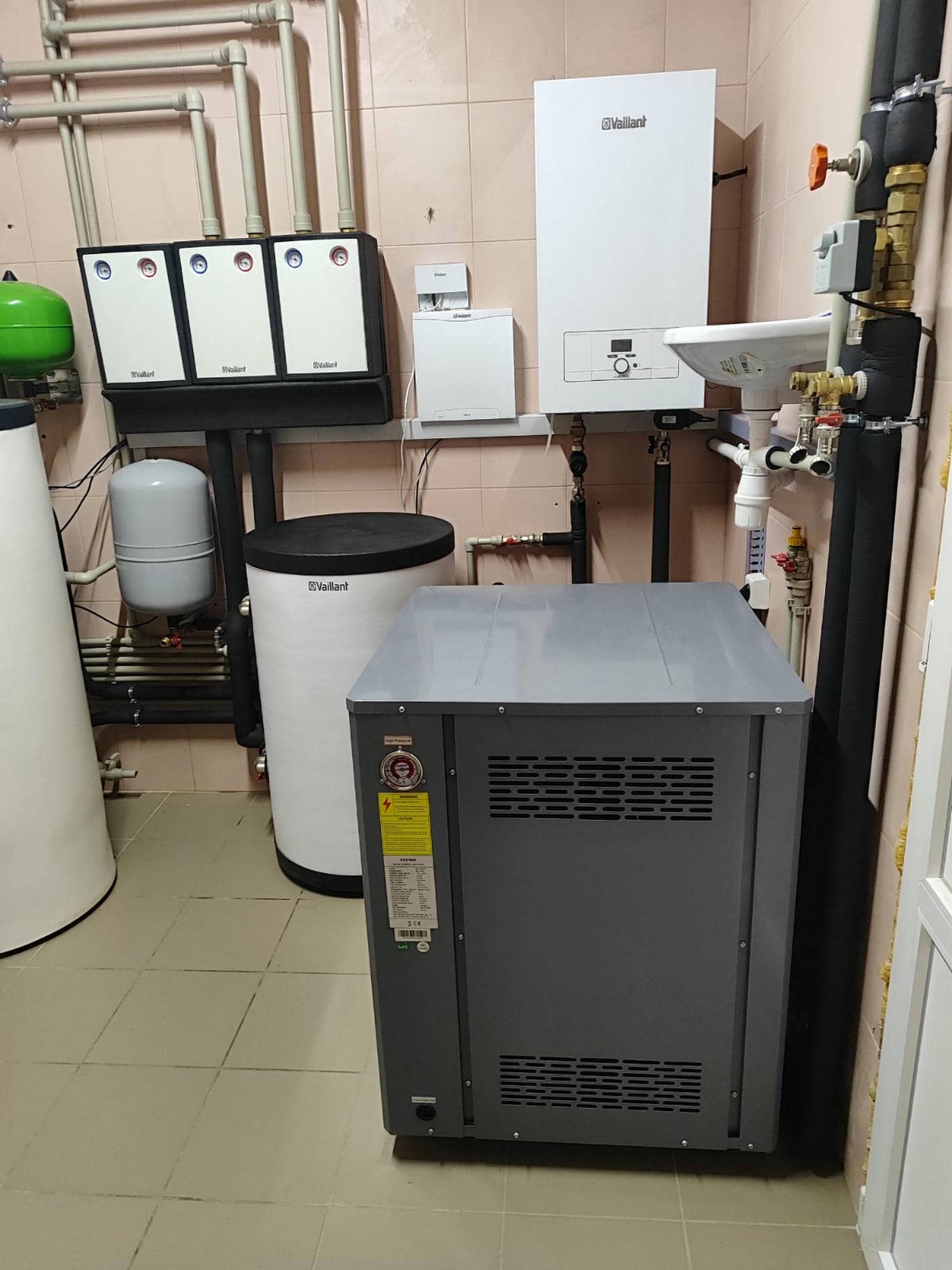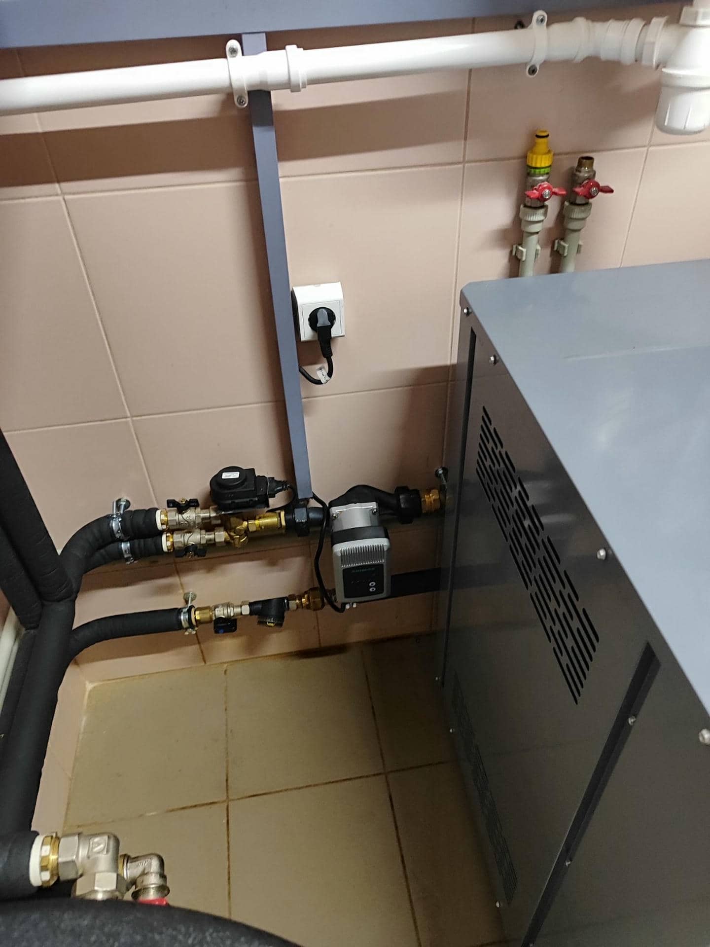 Блок теплового насосу було встановлено в сухому та вентильованому приміщенні — котельні — на оптимальній відстані до всіх компонентів системи, що спрощує обслуговування та дає можливість вільного доступу до з’єднань, клапанів та насосу.