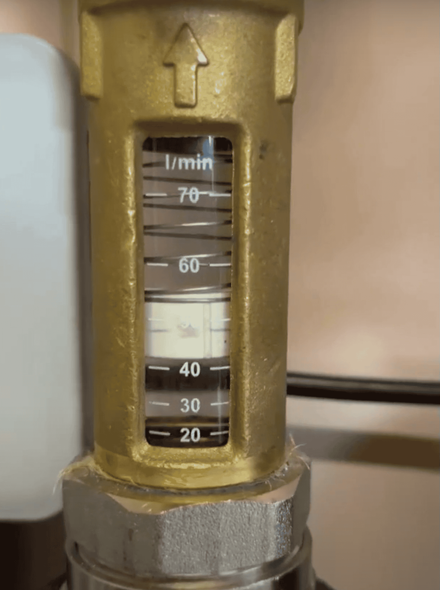 Розходомір води на виході, що калібрує необхідну кількість води для системи. Нормальний розхід води для даного теплового насосу 2-3,5 м³/год.
