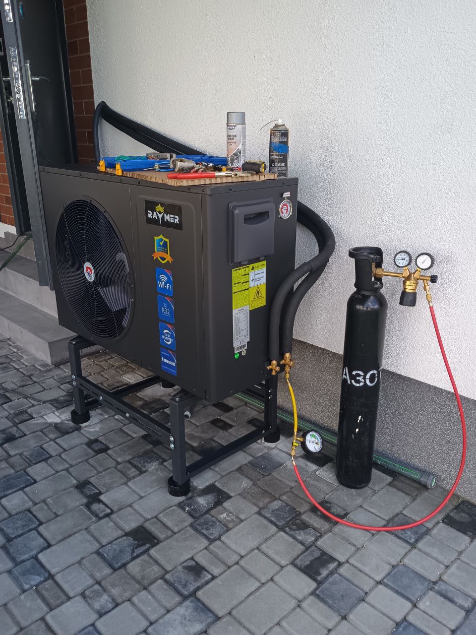 Зовнішній блок теплового насоса Raymer RAY-15DS2-EVI було встановлено безпосередньо біля входу до котельні, для якої передбачено окремий вхід. Такий варіант розміщення забезпечує зручність обслуговування обладнання та скорочує довжину трубопроводів між внутрішньою та зовнішньою частиною системи.