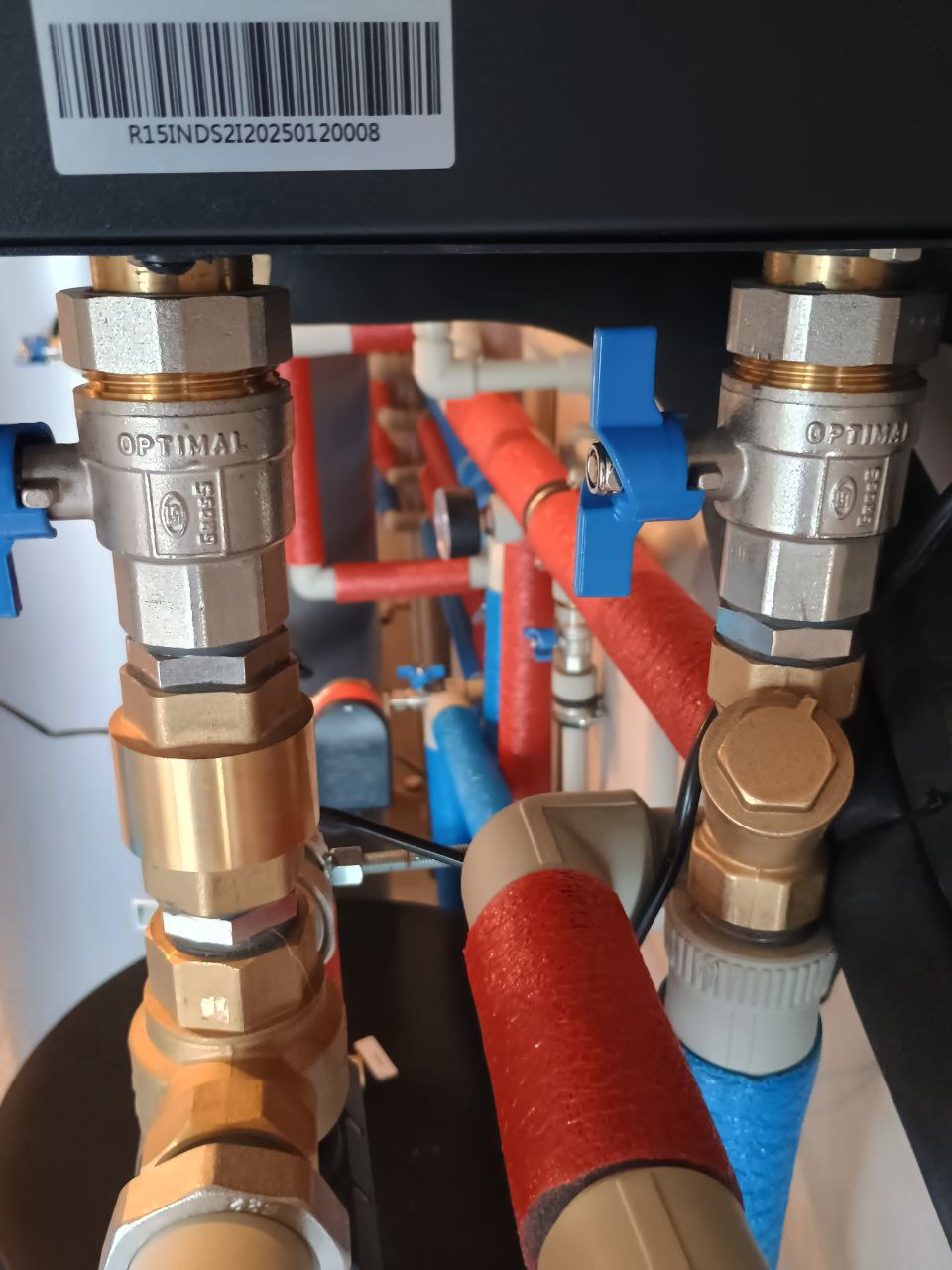 Поруч із гідромодулем було встановлено триходовий клапан, що дозволяє переключати потік теплоносія між різними напрямками — у контур опалення або на підігрів гарячої води. Це рішення робить систему більш гнучкою й автоматизованою, оскільки робота клапана синхронізується з роботою контролера теплового насоса.