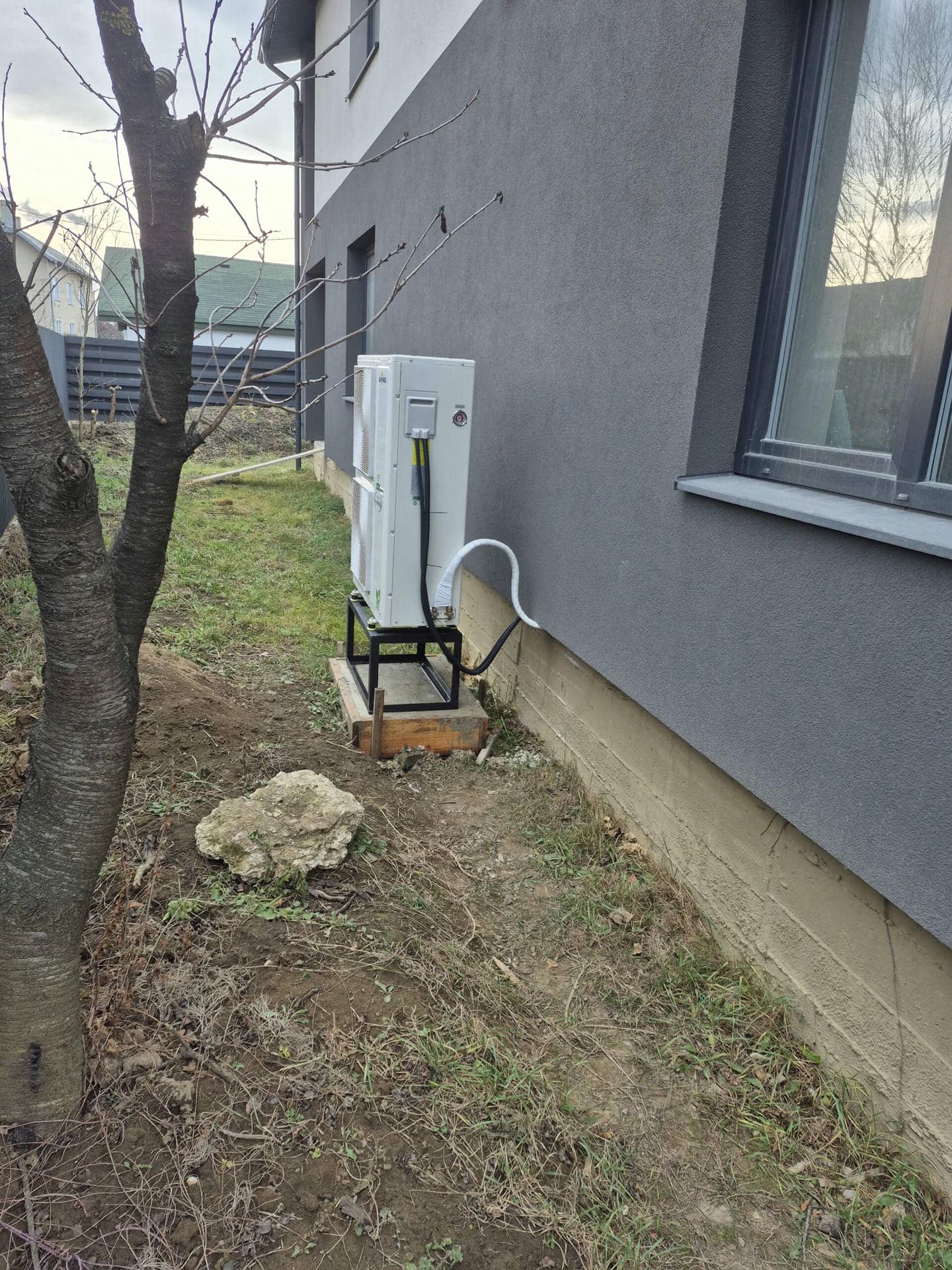 Зовнішній блок теплового насосу було встановлено на спеціальну металеву раму, яка закріплена на бетонній основі. Такий підхід забезпечує: