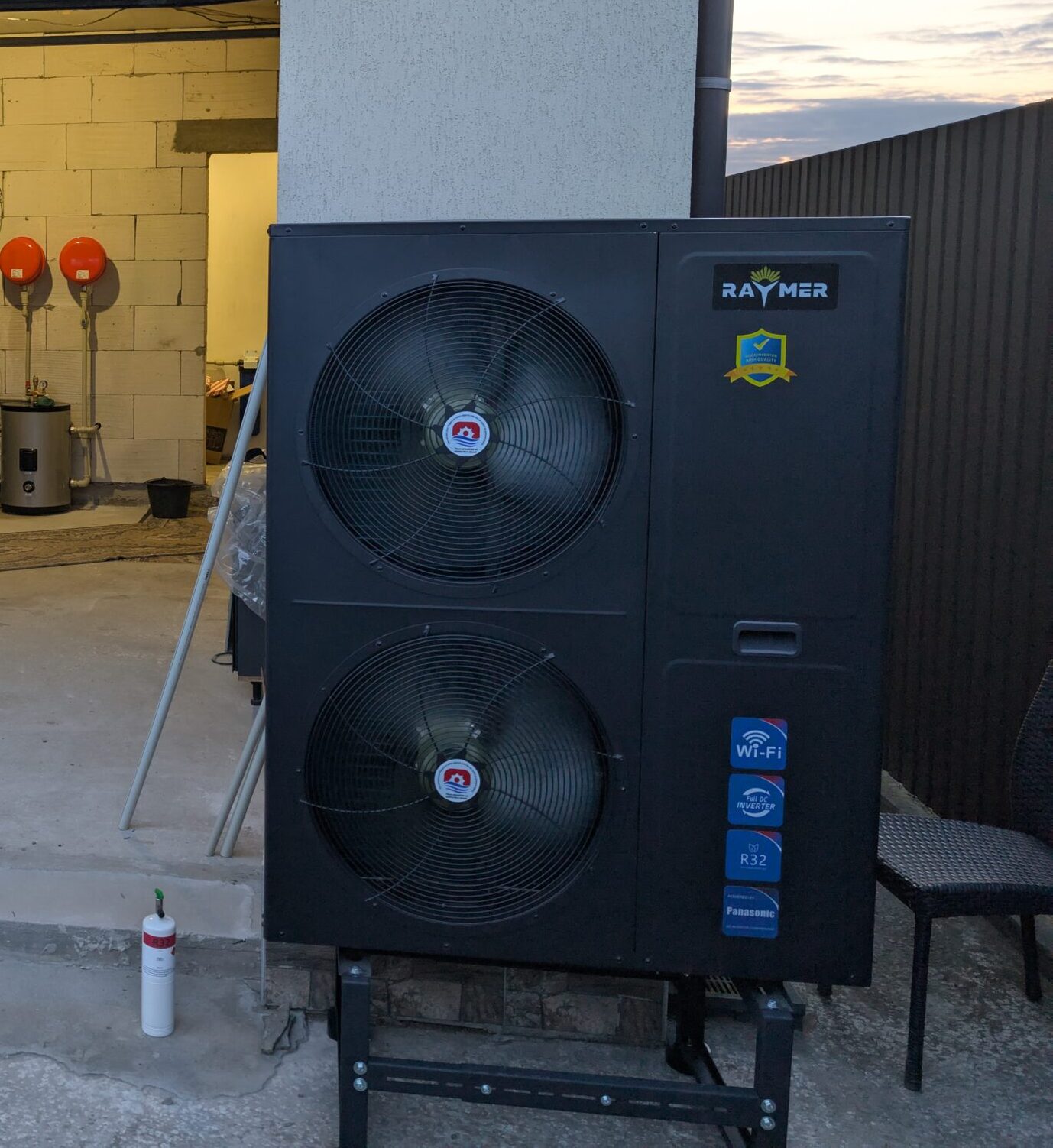 Зовнішній блок теплового насосу Raymer RAY-18DS2-EVI було встановлено на міцну металеву підставку біля заїзду в гараж. Таке розташування було обране з урахуванням зручності обслуговування та мінімального впливу на комфорт мешканців. Оскільки обладнання працює тихо, навіть при близькому розташуванні до житлових кімнат воно не створює шумового дискомфорту.