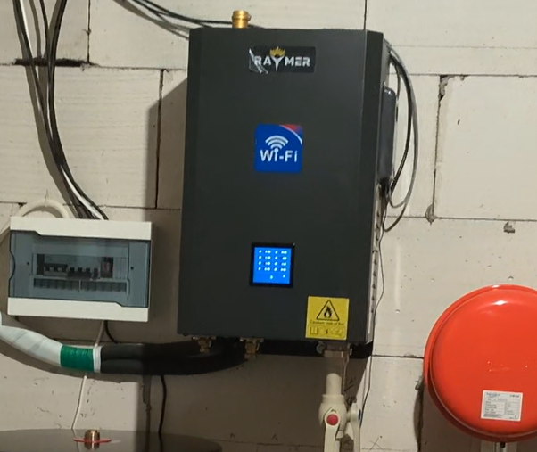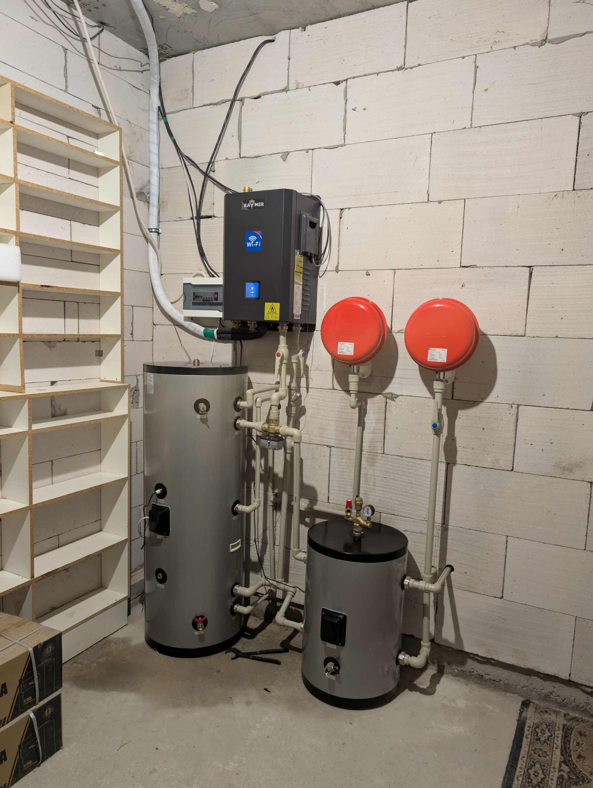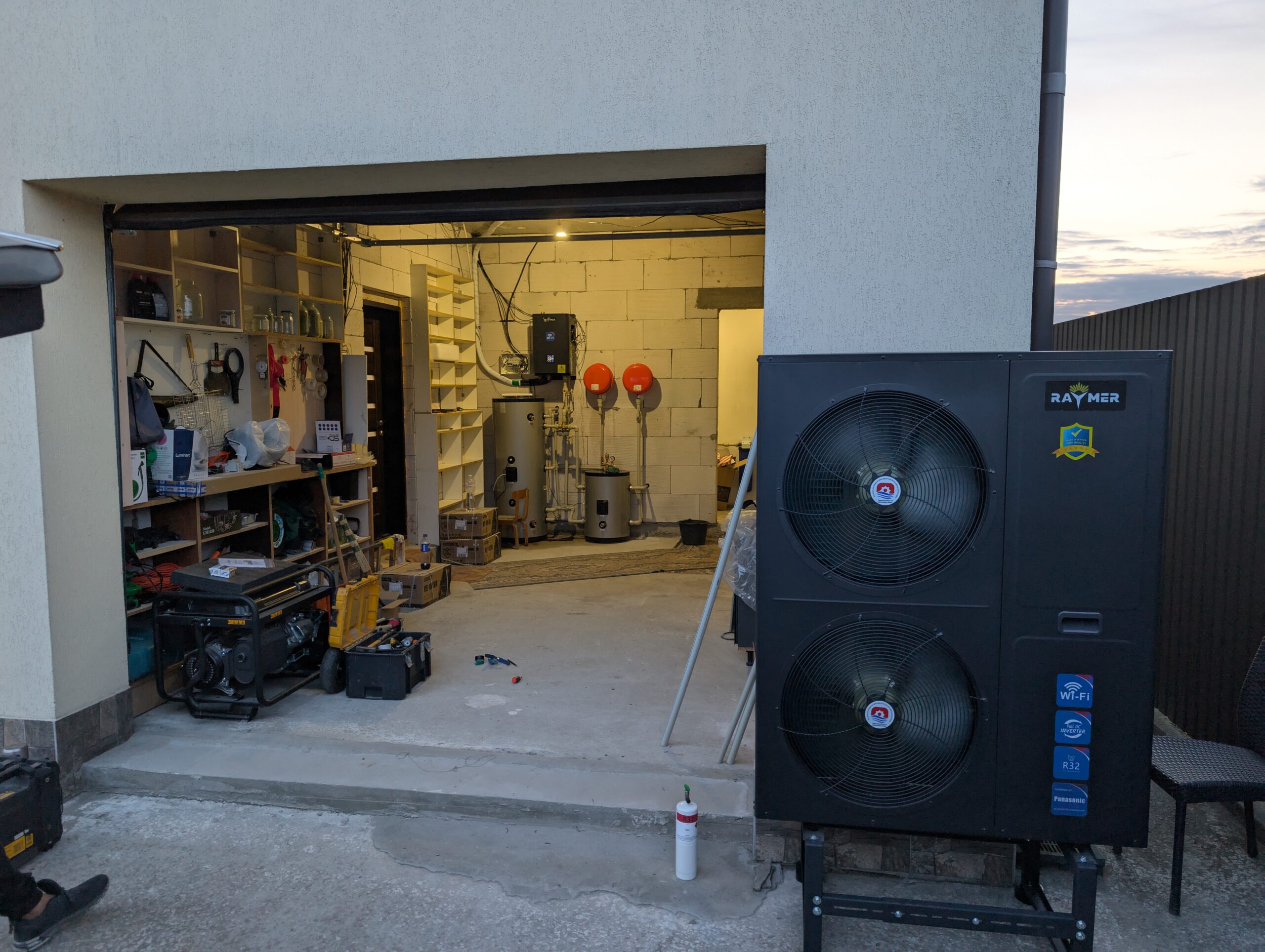 Внутрішній блок теплового насосу Raymer RAY-18DS2-EVI було розміщено у гаражі на задній стіні, де також встановлені буферні ємності та бак ГВП. Це рішення було прийнято з урахуванням обмеженого простору в існуючій котельні, де раніше знаходився лише електрокотел.