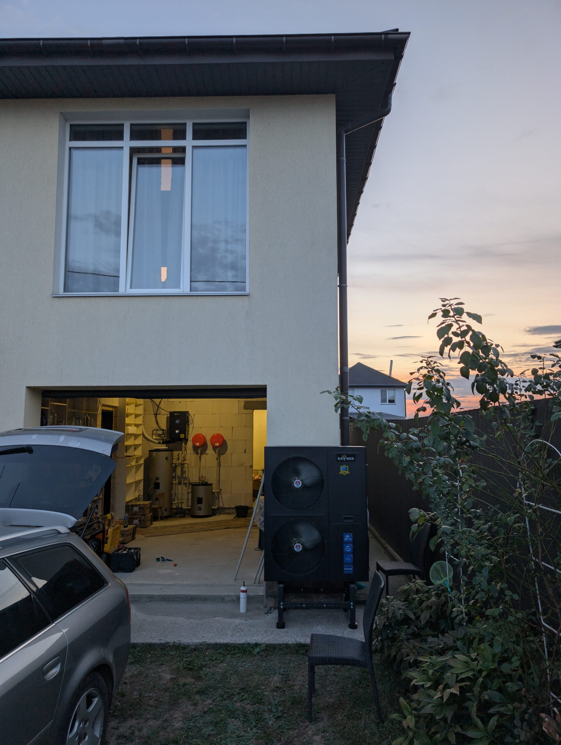 Зовнішній блок теплового насосу Raymer RAY-18DS2-EVI було встановлено на міцну металеву підставку біля заїзду в гараж. Таке розташування було обране з урахуванням зручності обслуговування та мінімального впливу на комфорт мешканців. Оскільки обладнання працює тихо, навіть при близькому розташуванні до житлових кімнат воно не створює шумового дискомфорту.