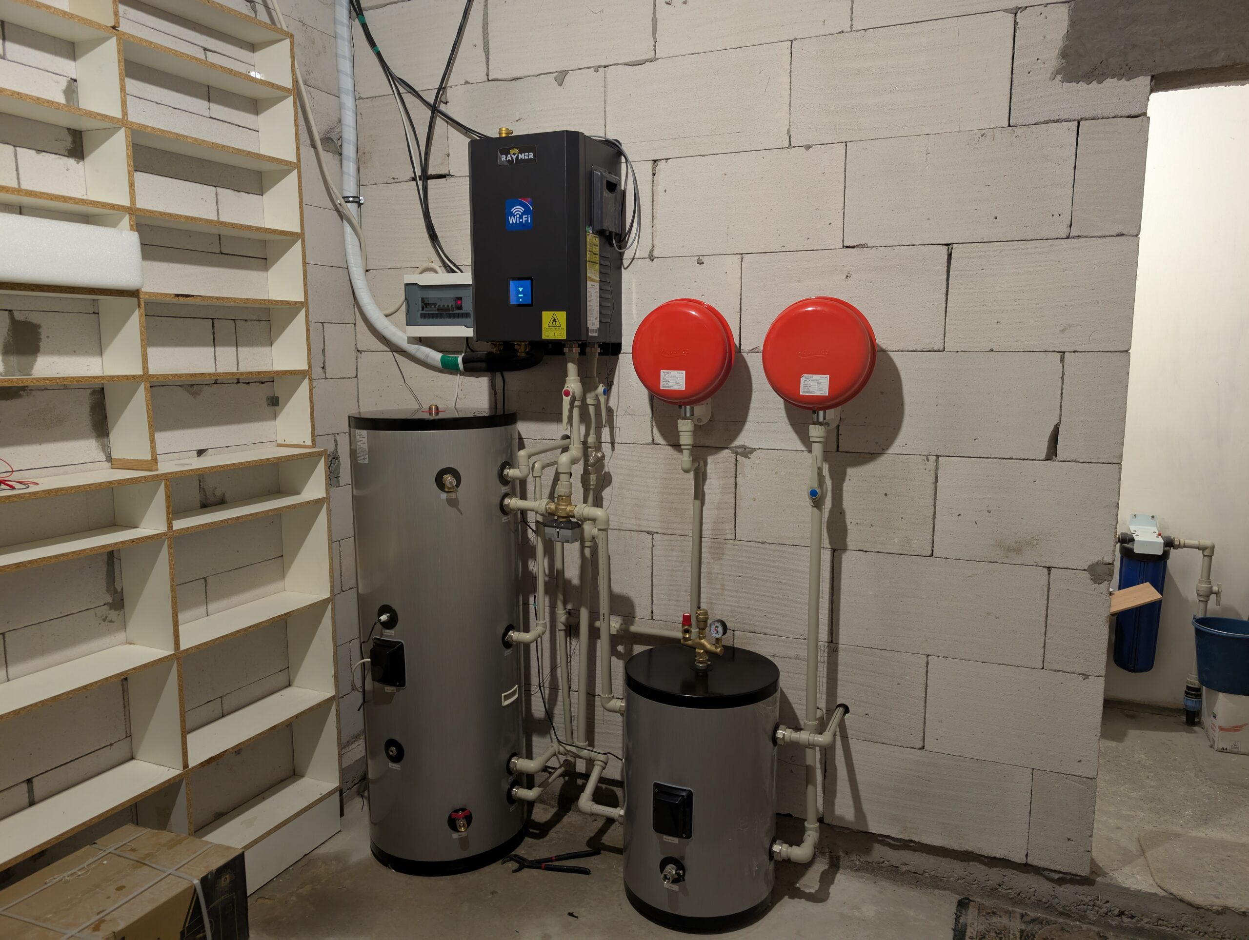 Внутрішній блок теплового насосу Raymer RAY-18DS2-EVI було розміщено у гаражі на задній стіні, де також встановлені буферні ємності та бак ГВП. Це рішення було прийнято з урахуванням обмеженого простору в існуючій котельні, де раніше знаходився лише електрокотел.