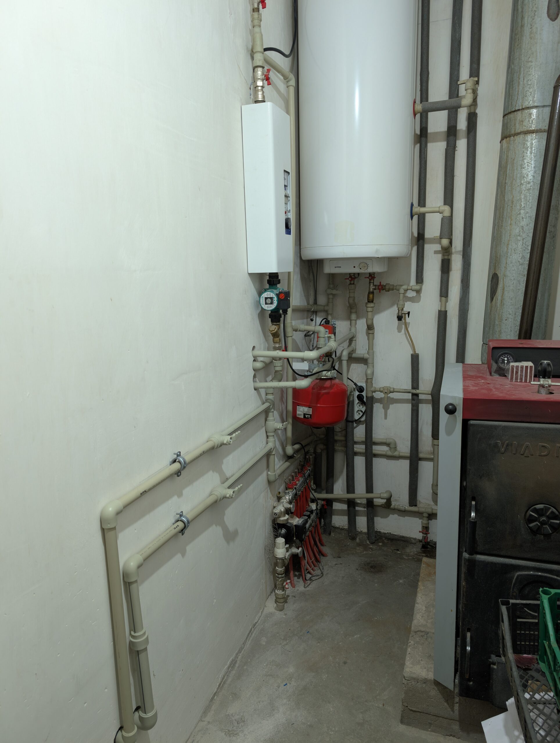 Біля електричного котла залишився в роботі циркуляційний насос, який подає теплоносій на другий поверх. Він працює через вимкнений електричний котел, що дозволяє уникнути перебудови трубопроводів. Для першого поверху система опалення побудована на основі теплої підлоги, тому новий тепловий насос одночасно забезпечує подачу теплоносія на дві гілки – радіаторну для другого поверху та контур теплої підлоги для першого.