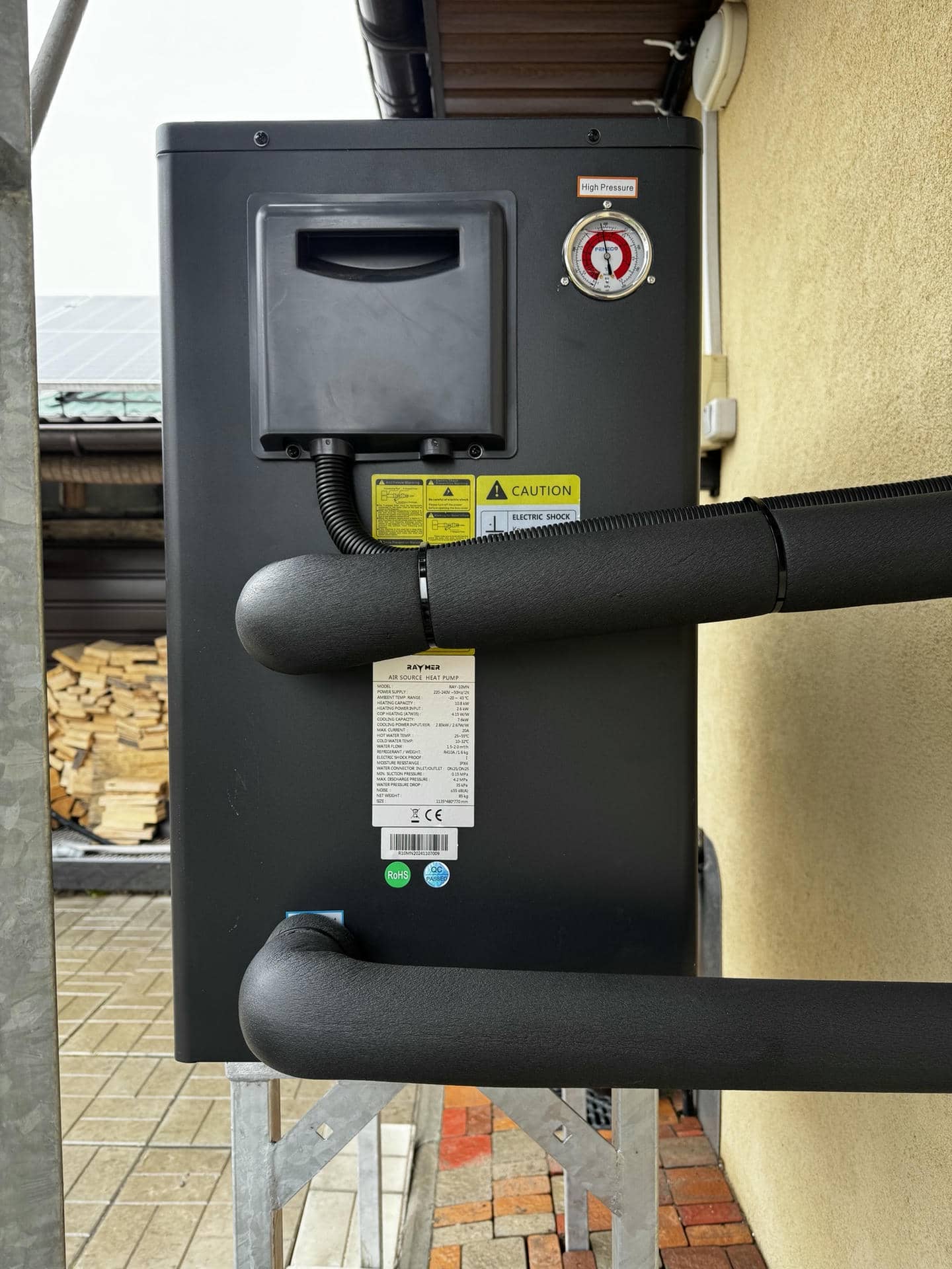 Моноблок Raymer RAY-10MN2 встановлений на спеціально виготовленій саморобній підставці у відкритому просторі. Металева конструкція підставки забезпечує стійкість та надійне закріплення теплового насоса, що дозволяє уникнути вібрацій під час його роботи. Таке розміщення сприяє безперешкодному проходженню повітря, необхідного для ефективного теплообміну, і гарантує стабільну роботу навіть у холодну пору року. Відкрите встановлення також спрощує доступ для обслуговування та візуального контролю стану блоку.