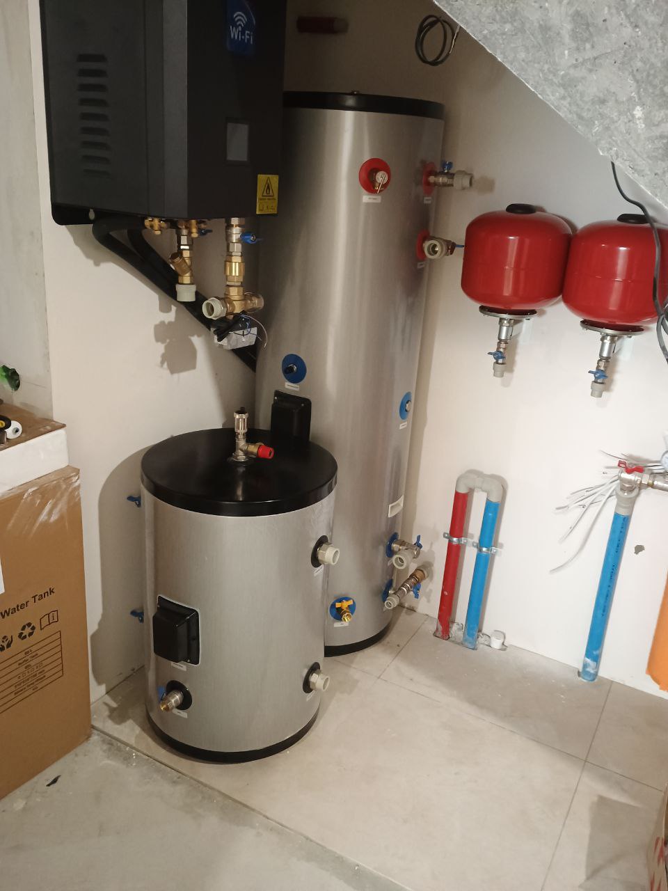Будинок, у якому проводився монтаж, має якісну теплоізоляцію, що значно знижує тепловтрати й дозволяє максимально ефективно використовувати сучасні джерела тепла. Водночас під час огляду стало зрозуміло, що в проєкті не було передбачено окремого технічного приміщення для встановлення обладнання. З огляду на це, було прийнято рішення розмістити гідромодуль та баки під сходовим простором. Такий підхід вимагав додаткових зусиль — монтаж зайняв трохи більше часу через обмежений доступ та необхідність адаптувати систему під нестандартне розташування. Проте кінцевий результат перевершив усі очікування: обладнання вдалося розмістити компактно, без втрати функціональності чи естетики, а система працює стабільно та ефективно.