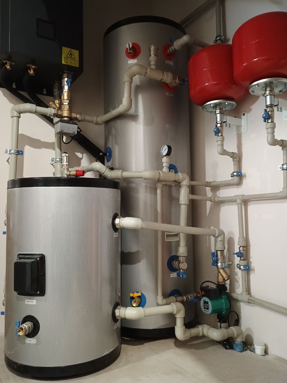 Баки встановлені на підлозі поруч один з одним, що забезпечує компактність і мінімальні втрати на довжину трубопроводів. Бак-накопичувач Raymer IMP 60 відповідає за акумулювання тепла, що генерується тепловим насосом, і передає його до системи опалення — зокрема теплої підлоги чи радіаторів. Бак ГВП Raymer DHWP 150 забезпечує нагрів та накопичення гарячої води для побутових потреб.