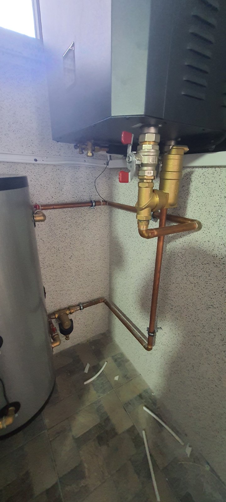 Монтаж внутрішнього блоку теплового насоса виконаний акуратно та продумано, що можна помітити по правильному розташуванню елементів та організації підключень. Встановлений гідромодуль розміщений на стіні в оптимальному місці, що забезпечує зручний доступ для обслуговування та візуального контролю. Всі з’єднання виконані з використанням мідних труб, що гарантує високу надійність і довговічність системи. Підключення оснащені необхідною запірною арматурою, що дозволяє швидко відключити або перенаправити потік у разі необхідності технічного обслуговування.
