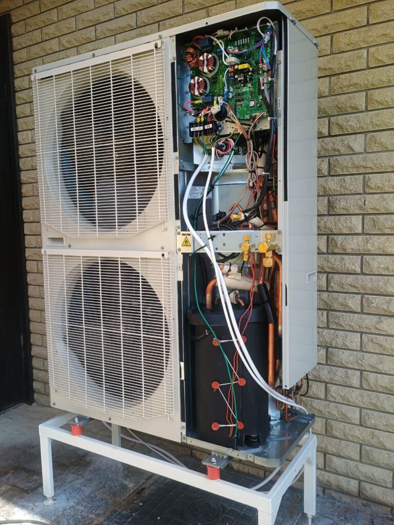 Зовнішній блок теплового насосу Mitsubishi HeatGuard 110NX  був встановлений на надійну металеву підставку біля будинку в мінімальній відстані до котельні, що полегшило монтаж теплотраси.