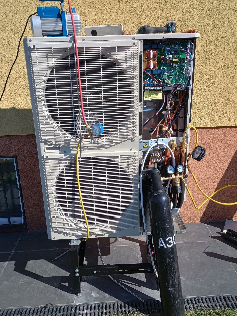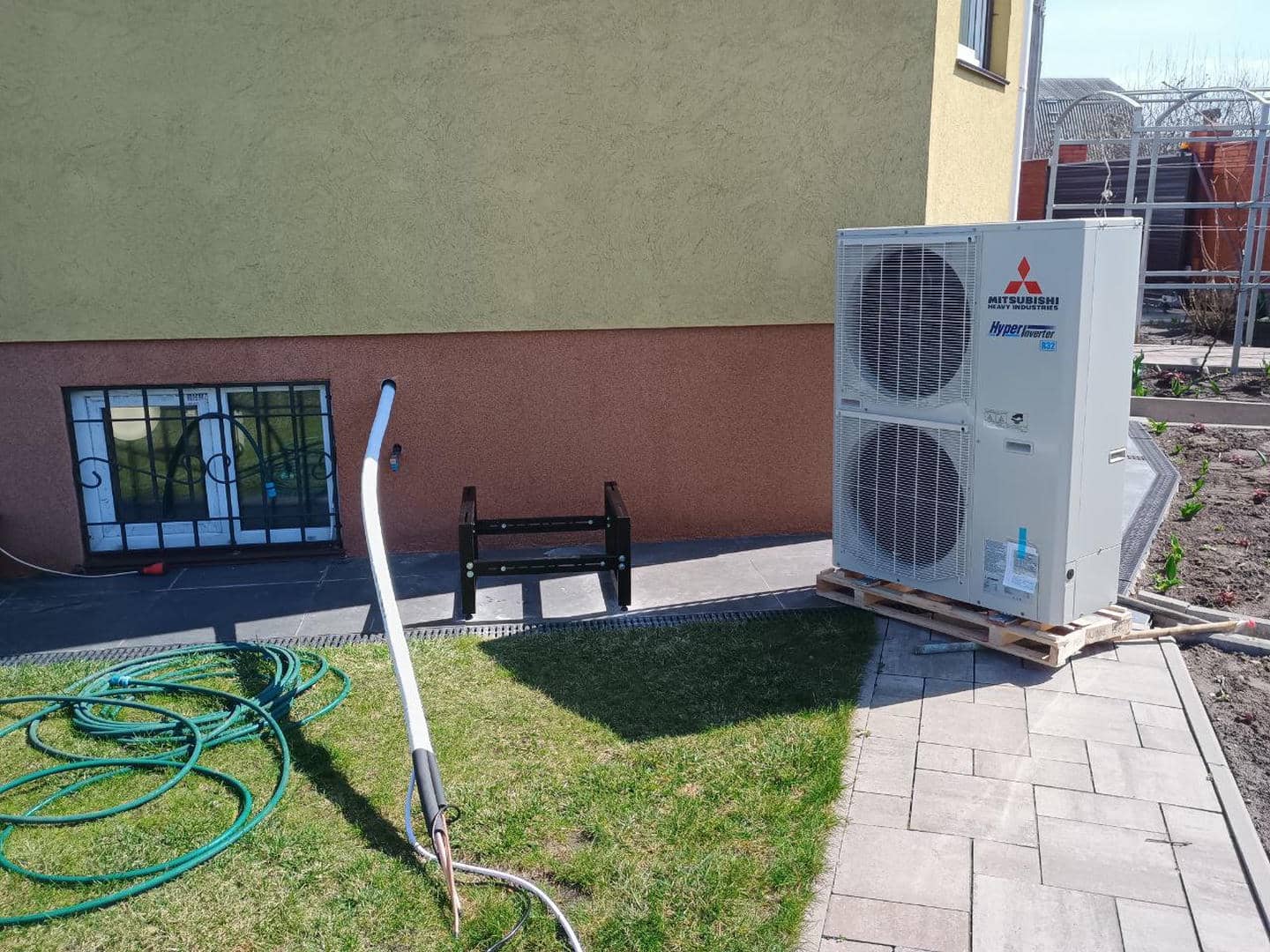Для розміщення зовнішнього блоку було обрано ділянку на північному фасаді будинку з хорошою вентиляцією. Основа вирівняна, встановлена металева антивібраційна рама для підняття блоку над рівнем землі, що захищає від снігу, бруду та опадів.