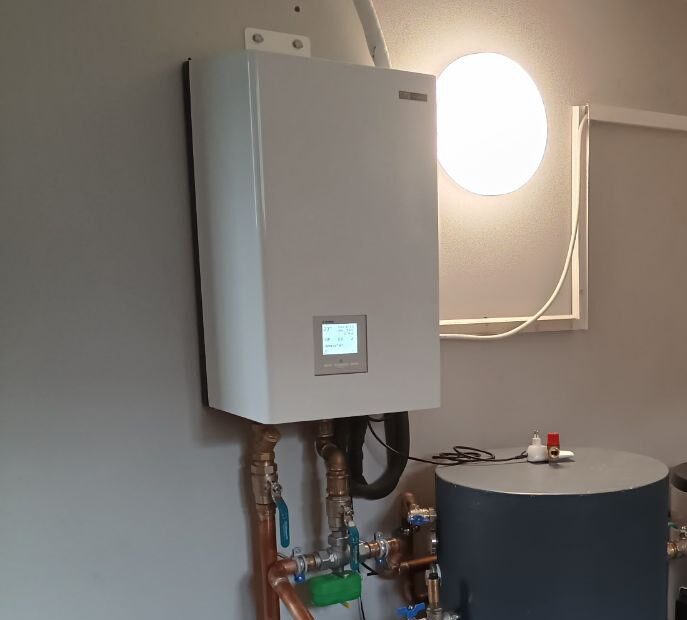 У процесі переобладнання системи опалення було демонтовано старий твердопаливний котел, на місці якого тепер змонтовано сучасне теплообмінне обладнання — буферну ємність та бойлер непрямого нагріву (бак ГВП), які працюють у парі з тепловим насосом Mitsubishi Heavy HeatGuard 160NX.
