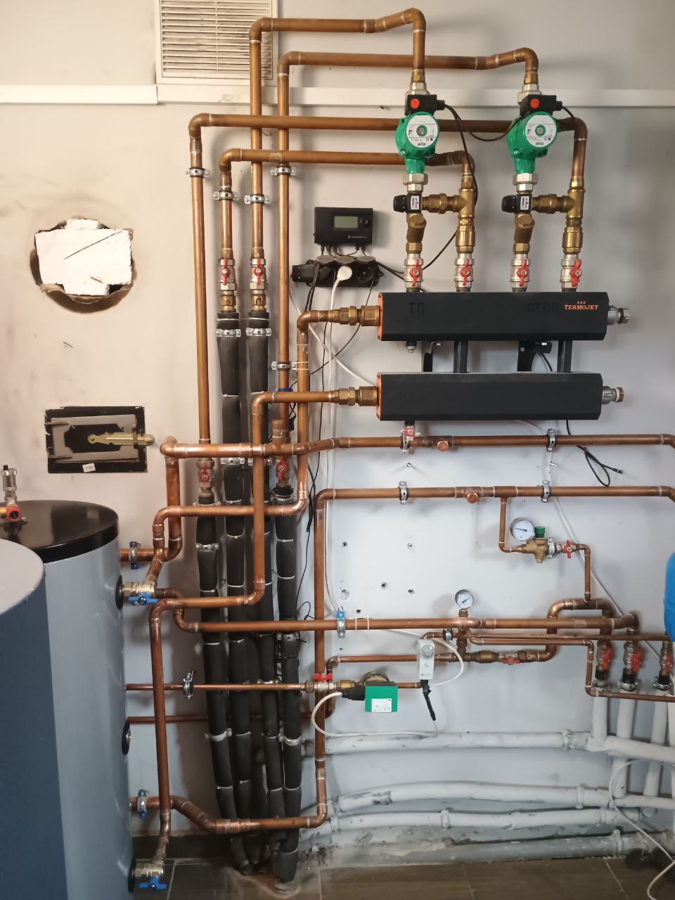 Ми встановили два гідравлічні розподільники (гідрострілки) із захисною теплоізоляцією. Вони дозволяють рівномірно розподіляти тепло між усіма контурами (тепла підлога, радіатори, бойлер тощо), не створюючи зайвого тиску на насос.