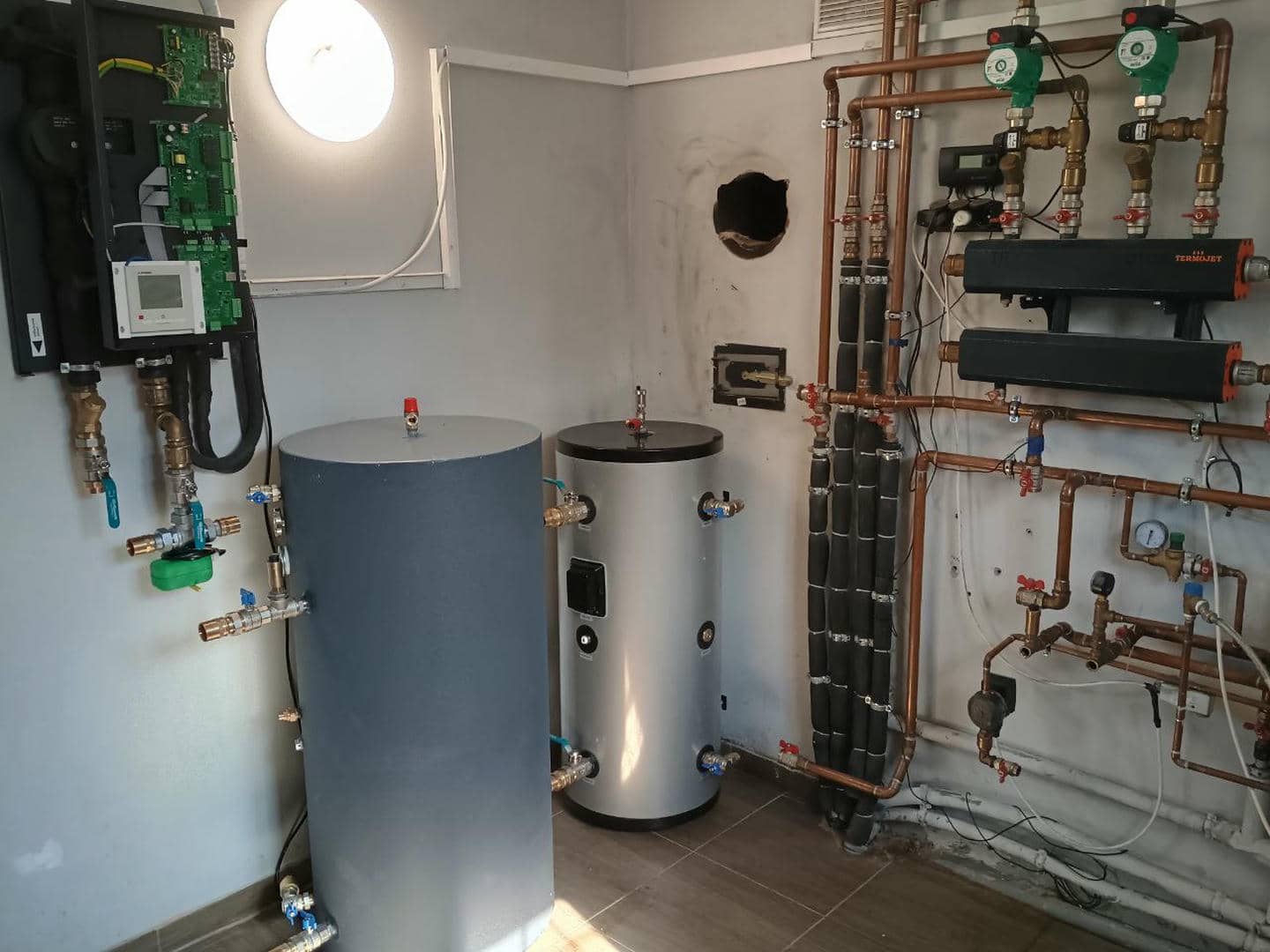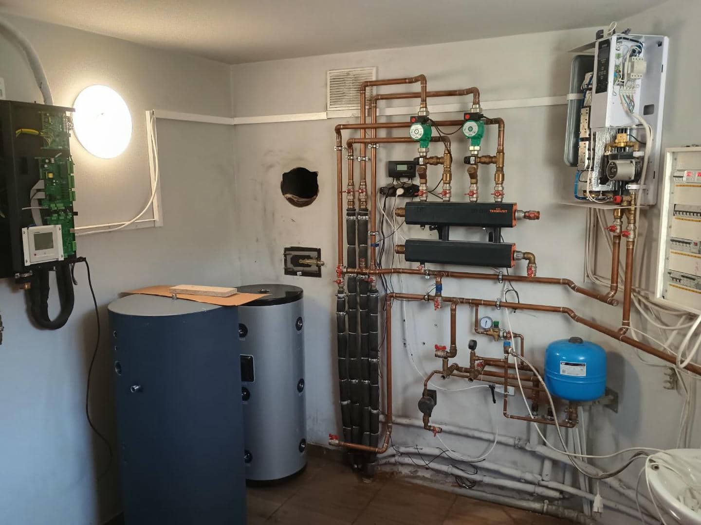 У процесі переобладнання системи опалення було демонтовано старий твердопаливний котел, на місці якого тепер змонтовано сучасне теплообмінне обладнання — буферну ємність та бойлер непрямого нагріву (бак ГВП), які працюють у парі з тепловим насосом Mitsubishi Heavy HeatGuard 160NX.