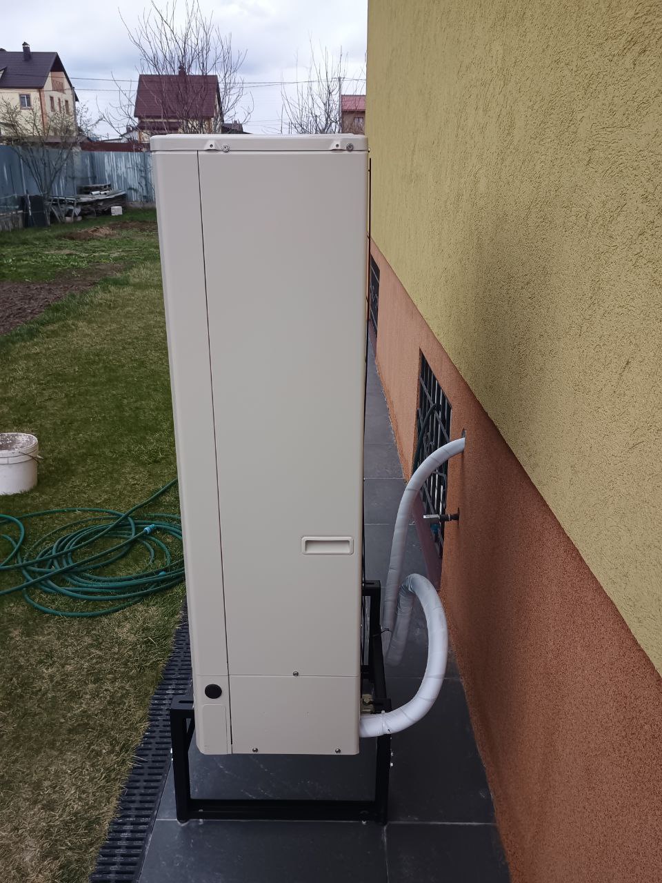 Для розміщення зовнішнього блоку було обрано ділянку на північному фасаді будинку з хорошою вентиляцією. Основа вирівняна, встановлена металева антивібраційна рама для підняття блоку над рівнем землі, що захищає від снігу, бруду та опадів.