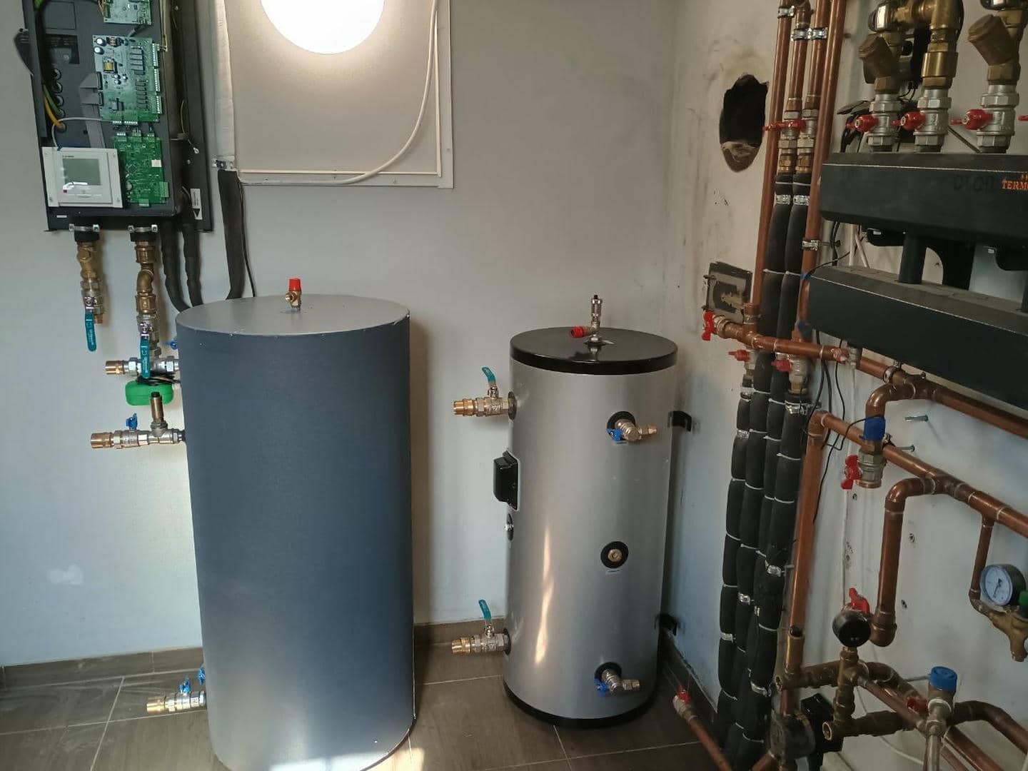 Ми встановили два гідравлічні розподільники (гідрострілки) із захисною теплоізоляцією. Вони дозволяють рівномірно розподіляти тепло між усіма контурами (тепла підлога, радіатори, бойлер тощо), не створюючи зайвого тиску на насос.