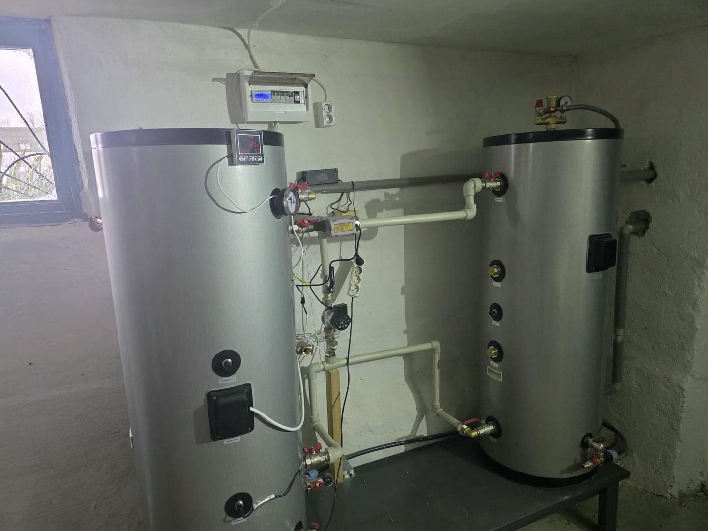 Перед монтажем було визначено оптимальне місце у технічному приміщенні, яке дозволяє зручно під’єднати обидва баки до системи опалення та водопостачання. Поверхня була ретельно підготовлена для забезпечення стійкості обладнання та мінімізації вібрацій.