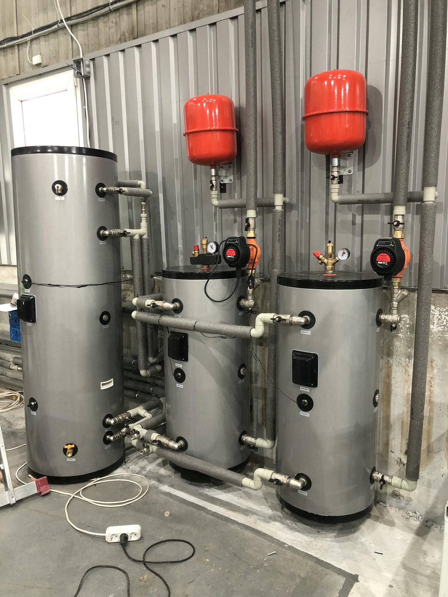 Після завершення монтажу двох гідромодулів Raymer та їх інтеграції з буферними ємностями, наступним етапом стала інсталяція та підключення бака непрямого нагріву Raymer DHWP 300L. Основне призначення цього баку — забезпечення безперебійного гарячого водопостачання для потреб виробничого цеху площею 600 м², а також оптимізація ефективності роботи теплових насосів.