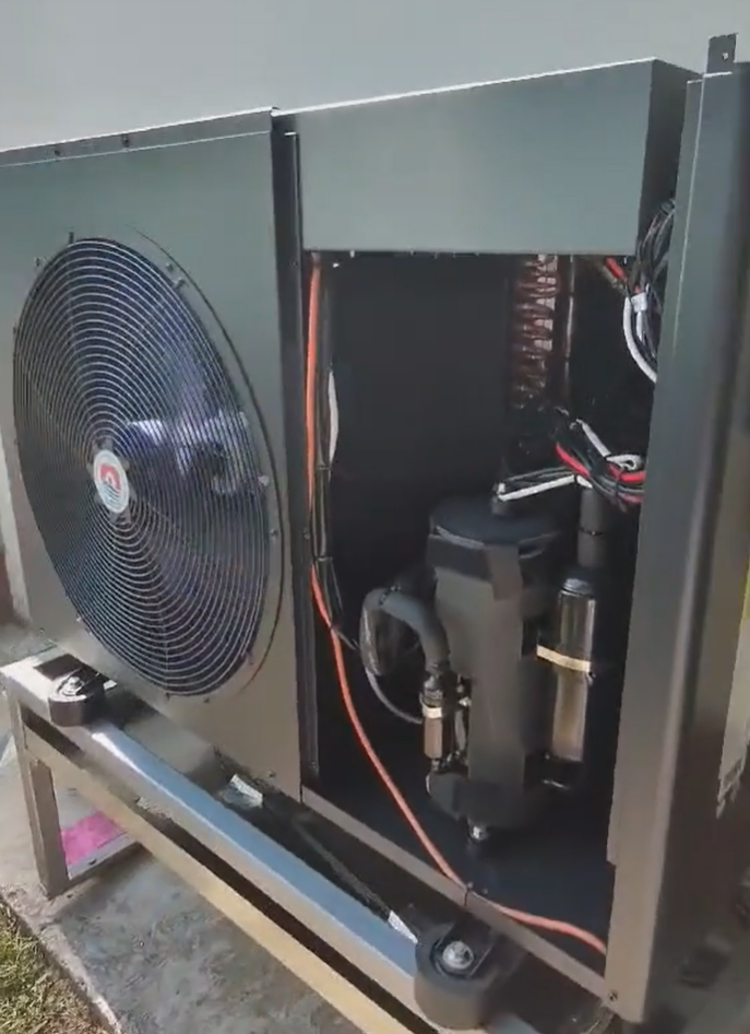 Після детального аналізу було вирішено встановити тепловий насос Raymer RAY-10DS2-EVI. Це сучасна інверторна модель із технологією EVI, яка забезпечує стабільну роботу навіть при низьких зовнішніх температурах до -30°С. Тепловий насос дозволяє отримати 3–4 кВт тепла на кожен спожитий 1 кВт електроенергії, що робить його у декілька разів ефективнішим за звичайний електрокотел.