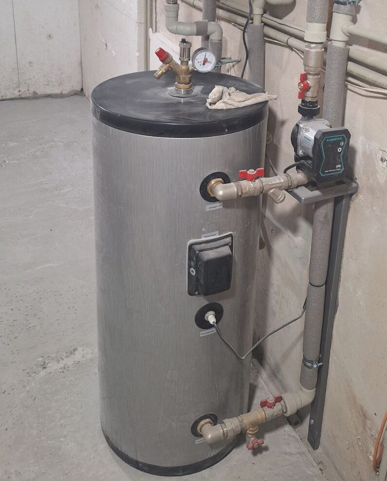 Для забезпечення стабільної та ефективної роботи системи опалення у котельні було змонтовано буферну ємність Raymer IMP об’ємом 100 літрів. Цей елемент виконує важливу функцію акумулювання тепла, що дозволяє зменшити кількість пусків і зупинок теплового насосу, продовжуючи термін його служби та підвищуючи енергоефективність.