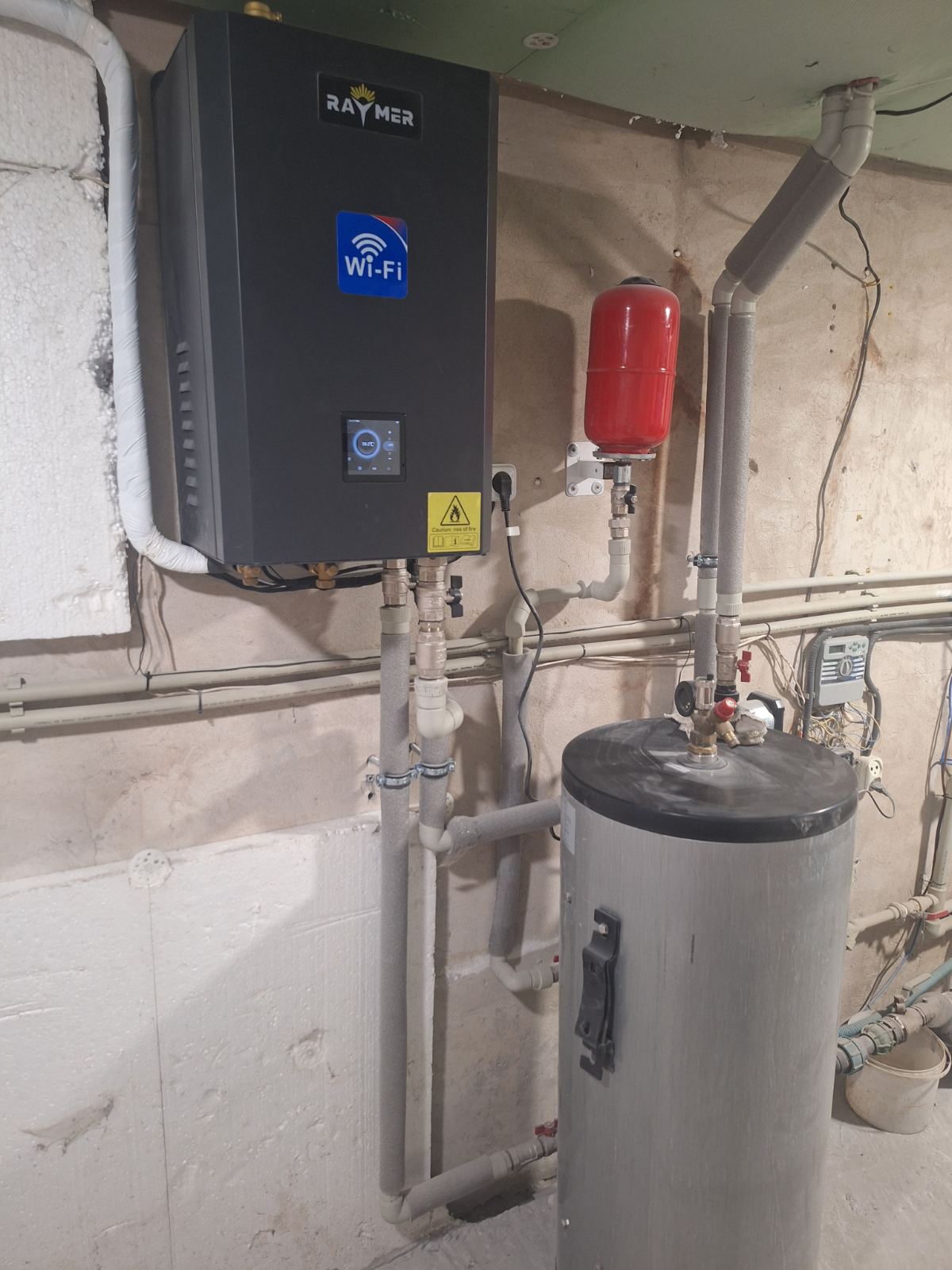 Внутрішній блок теплового насосу Raymer RAY-10DS2-EVI було змонтовано у напівпідвальному приміщенні, яке виконує роль котельні. Це приміщення вже було обладнане необхідними елементами інженерної інфраструктури — тут розташовані бойлер для гарячого водопостачання, інвертор Deye та акумуляторні батареї, що забезпечують роботу незалежної енергосистеми на базі сонячних панелей. Такий вибір місця встановлення дозволив компактно інтегрувати тепловий насос у вже існуючий комплекс обладнання.