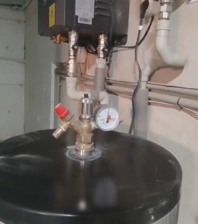 Для забезпечення стабільної та ефективної роботи системи опалення у котельні було змонтовано буферну ємність Raymer IMP об’ємом 100 літрів. Цей елемент виконує важливу функцію акумулювання тепла, що дозволяє зменшити кількість пусків і зупинок теплового насосу, продовжуючи термін його служби та підвищуючи енергоефективність.