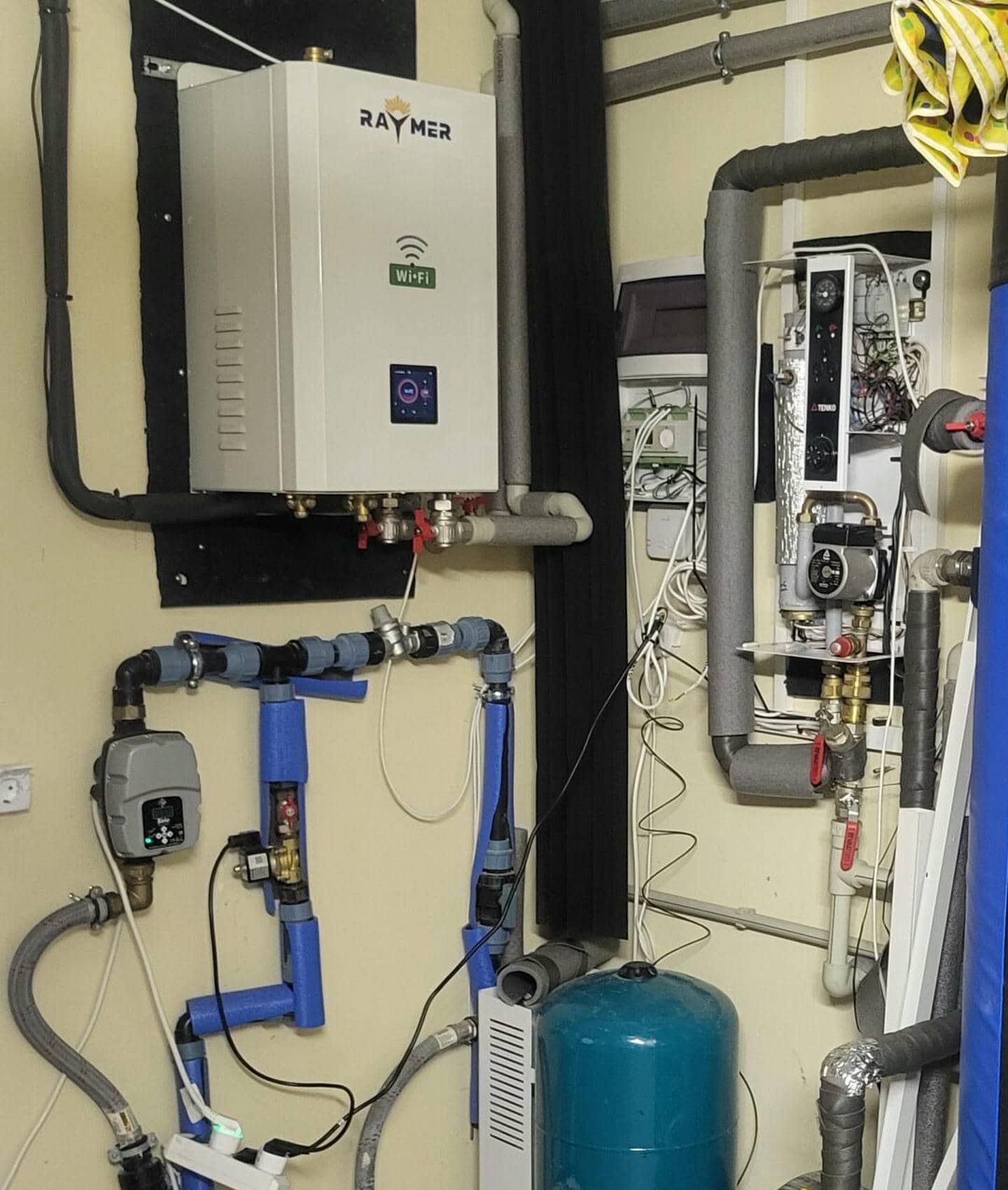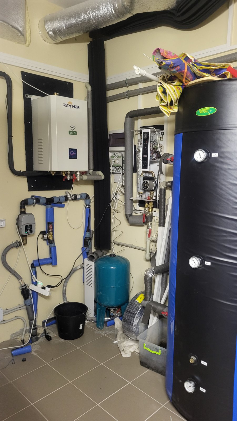 Внутрішній блок теплового насоса Raymer RAY-15DS1 EVI був встановлений у котельні будинку. Блок розміщено на спеціально підготовленому місці, яке забезпечує зручний доступ для обслуговування та підключення всіх необхідних комунікацій. Завдяки компактному розміщенню всередині приміщення, вдалося зберегти простір та забезпечити оптимальну циркуляцію повітря.
